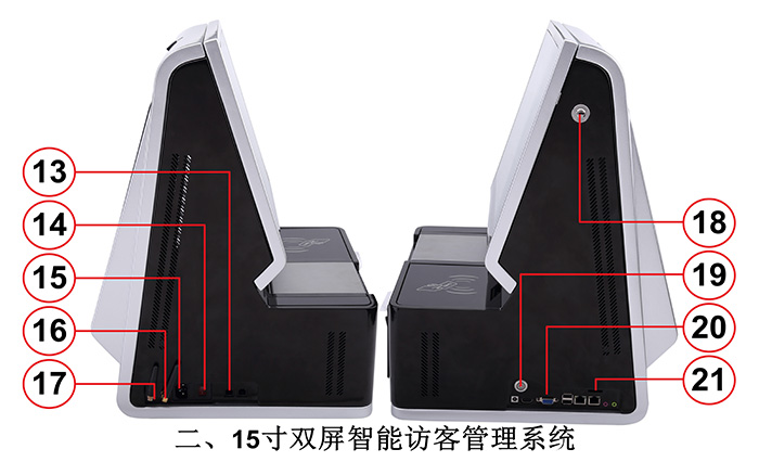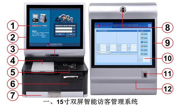15寸雙屏智能訪客登記管理一體機(jī)集成工控主板,液晶屏,電容觸摸屏,鍵盤,證件掃描采集儀,身份證閱讀器,IC卡發(fā)卡器/讀卡器,指紋儀,條碼掃描儀,熱敏打印機(jī),攝像頭,電話模塊,喇叭等,15寸雙屏智能訪客機(jī)是由博奧智能科技有限公司研發(fā)生產(chǎn)的一款高科智能訪客登記管理終端,采用15寸工業(yè)液晶屏,前后雙屏,主板自主研發(fā),X86結(jié)構(gòu),板載Intel第四代Hasswall和第五代Broadwell平臺(tái)CPU,客戶行選定,板載4G/8G內(nèi)存,客戶也可自行選定內(nèi)存大小 ,板載WIFI藍(lán)牙模塊及大功率功放模塊,固態(tài)硬盤存儲(chǔ);設(shè)備外殼采用鈑金材料,表面精工打磨,烤漆清油等處理工藝,防銹、耐磨;它具有結(jié)構(gòu)合理,操作簡便,速度快,運(yùn)行穩(wěn)定,性能可靠,功能強(qiáng)大,集成度高,適用領(lǐng)域廣;外觀精美、造型獨(dú)特,款式新穎,色澤光潤、質(zhì)感一流等特點(diǎn)。