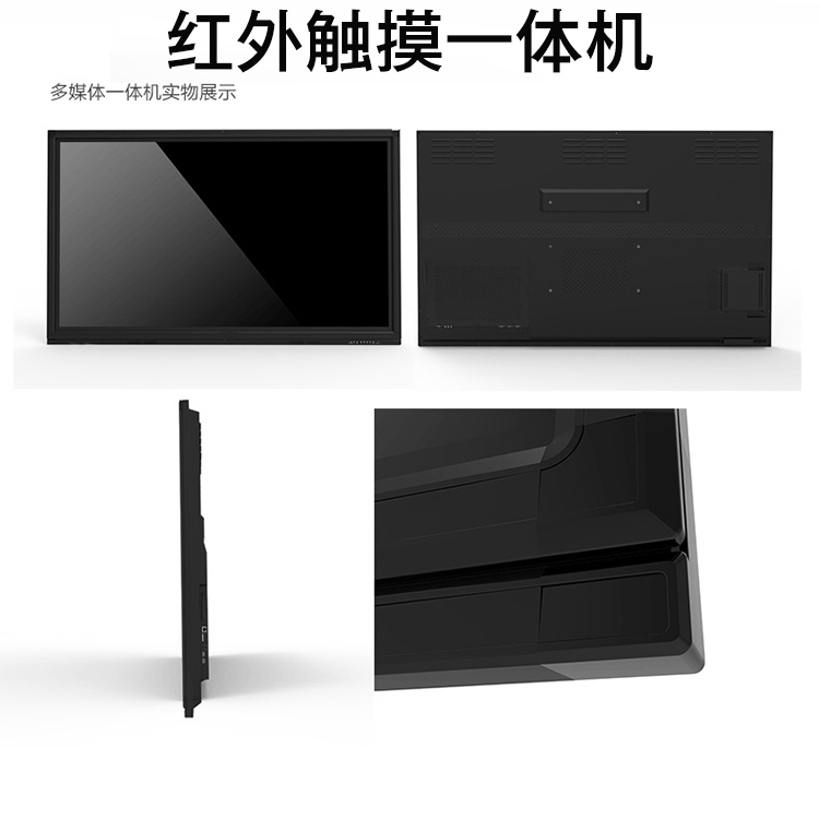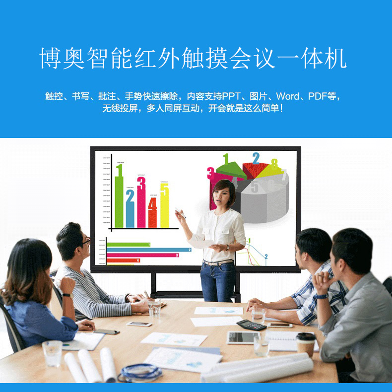? ? ? 博奧智能多媒體一體機(jī)內(nèi)置4MM鋼化玻璃,防磕碰,損壞,超窄液晶顯示屏,178度廣視角,4K高清,讓屏幕靚麗安全,尺寸規(guī)格全,涵蓋55寸、60寸、65寸、70寸、75寸、84寸、86寸、98寸;每款一體機(jī)采用多點(diǎn)紅外觸控觸摸屏,靈敏度高,支持6點(diǎn)10點(diǎn)觸控,可多人同時在屏幕上操作演示,感應(yīng)速度靈敏,可以在書寫功能界面下書寫、批注,放大、縮小、擦除、拖拽等快捷操作,內(nèi)容支持PPT,圖片,Word,PDF等,同時可對對圖片進(jìn)行拖拽和放大縮小;支持IOS? Android Windows設(shè)備無線投屏顯示;支持多人多設(shè)備連接屏幕,共同操作畫面,實現(xiàn)多人同屏互動;內(nèi)置高保真音箱;前置百萬像素級攝像頭,可以實時拍攝會場效果,外置接口豐富,HDMI、VGA、YPbPr、AV、USB、等多種接口方便使用,