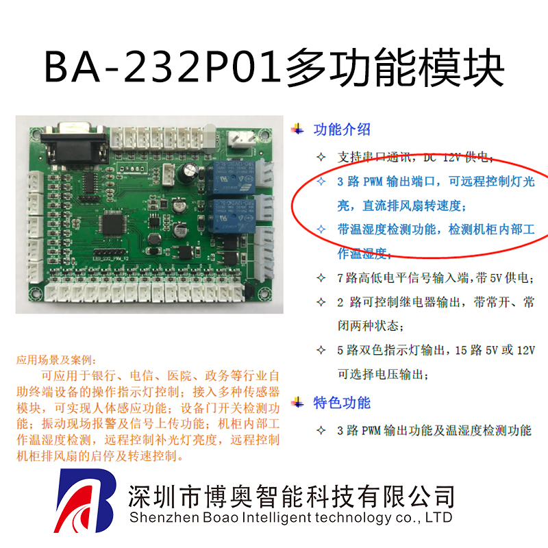 該產(chǎn)品是專為自助終端設備配套開發(fā)的一款多功能控制模塊,可應用此模塊實現(xiàn)各模塊操作指示燈的提示控制、接收開關(guān)量的輸入上傳、繼電器常開、常閉輸出、PWM輸出功能以及溫濕度檢測功能;