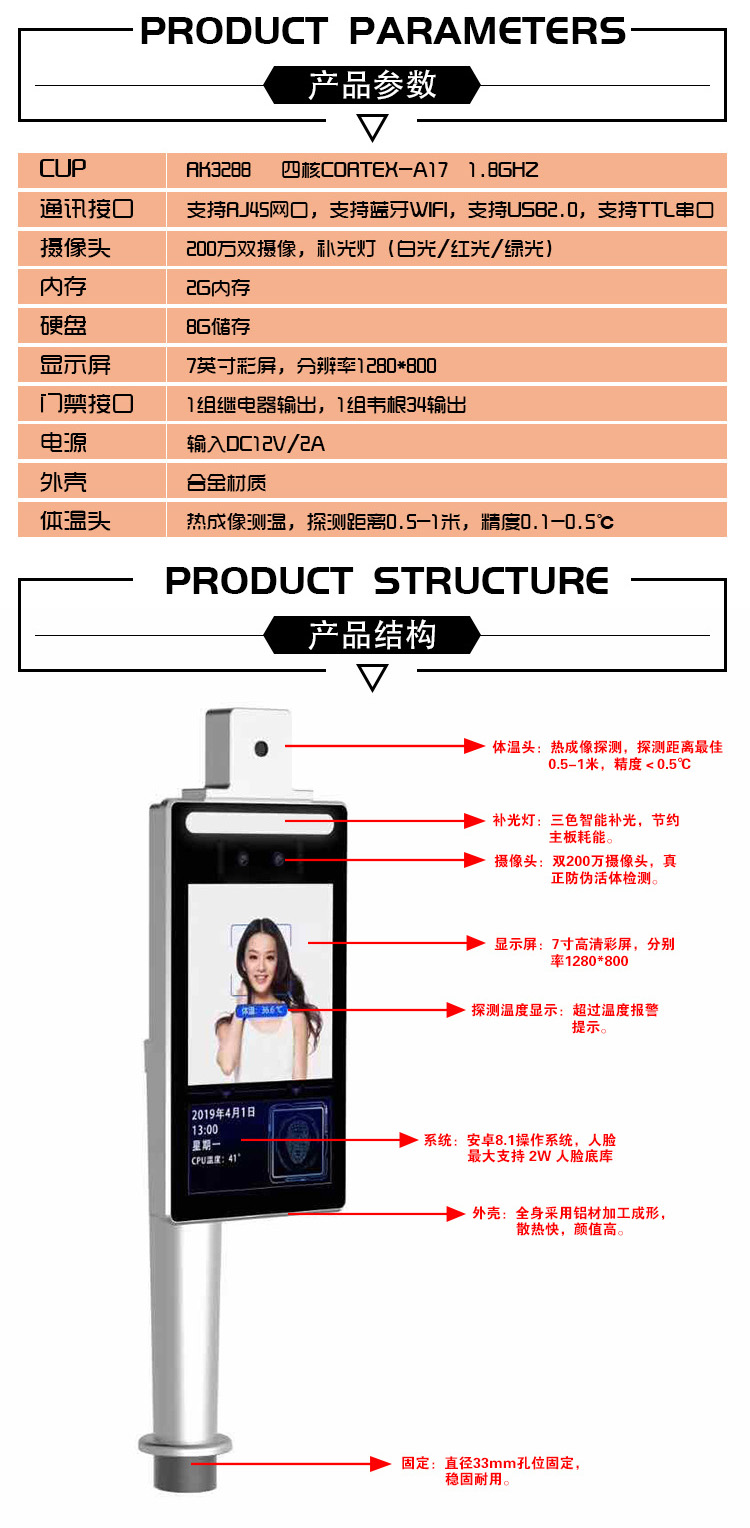 人行通道管理系統(tǒng)由人臉識(shí)別自動(dòng)測(cè)溫一體機(jī)和閘機(jī)組成,主要應(yīng)用在學(xué)校、小區(qū)、工廠、寫字樓等門口及大廳,對(duì)進(jìn)出人員能夠自動(dòng)快速識(shí)別測(cè)溫及自動(dòng)報(bào)警功能;從而且代替了手持體溫槍進(jìn)行測(cè)溫,因此保證保衛(wèi)人員不被傳染,也提高了工作效率,使通道更加順暢,解決了排除而造成的交叉感染諸多問題;同時(shí)系統(tǒng)具有訪客登記門禁考勤等功能。