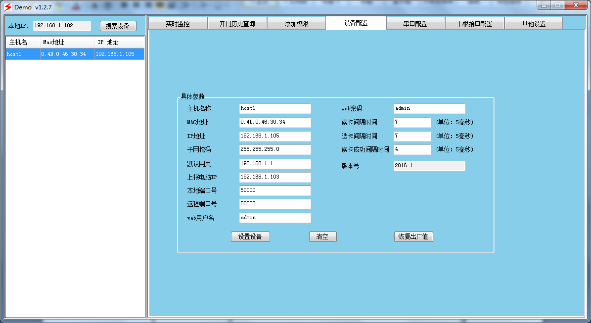 ??? ?將設(shè)備通過(guò)網(wǎng)線與電腦直接連接或者通過(guò)交換機(jī)連接,在軟件中點(diǎn)擊“搜索設(shè)備”按鈕,列表中將自動(dòng)列出網(wǎng)絡(luò)中的門(mén)禁控制器設(shè)備。選擇記錄后可以查看并修改此設(shè)備的配置。注意必須保證計(jì)算機(jī)IP地址與設(shè)備IP地址在同一個(gè)網(wǎng)段,默認(rèn)為192.168.1.XX,否則不能成功搜索和修改。(通過(guò)網(wǎng)線直連電腦的情況,可能因?yàn)榫W(wǎng)卡不能自適應(yīng)導(dǎo)致搜索或者配置不成功,建議通過(guò)路由器連接)。如果計(jì)算機(jī)IP地址已經(jīng)修改為192.168.1.XX仍然不能搜索到設(shè)備,可以人工恢復(fù)默認(rèn)設(shè)置(在斷電時(shí)按住恢復(fù)按鈕加電,5秒后松開(kāi),鳴蜂器響即恢復(fù)成功)。