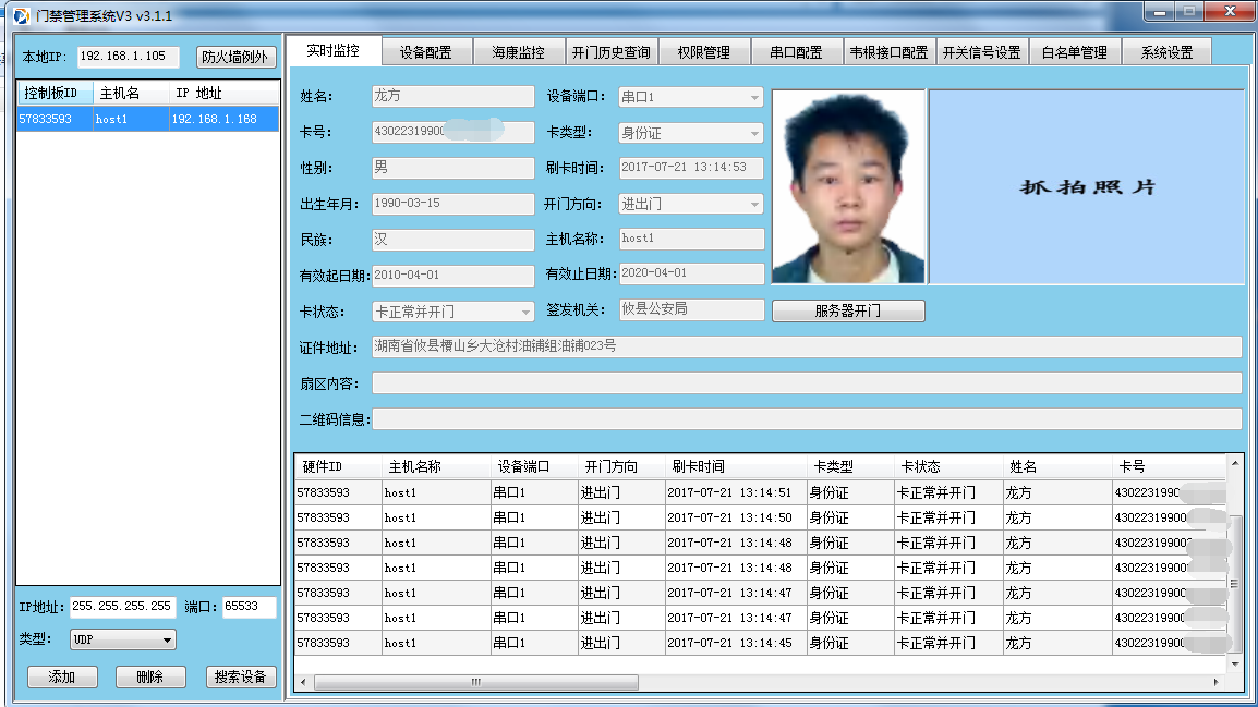 ??? 電腦白名單驗(yàn)證。設(shè)備讀取到身份證信息后,發(fā)送給電腦,則電腦軟件負(fù)責(zé)檢查身份證是否有開(kāi)門(mén)權(quán)限。這種方式可以通過(guò)電腦軟件實(shí)現(xiàn)大數(shù)據(jù)量的白名單驗(yàn)證,以及其它時(shí)段權(quán)限控制。