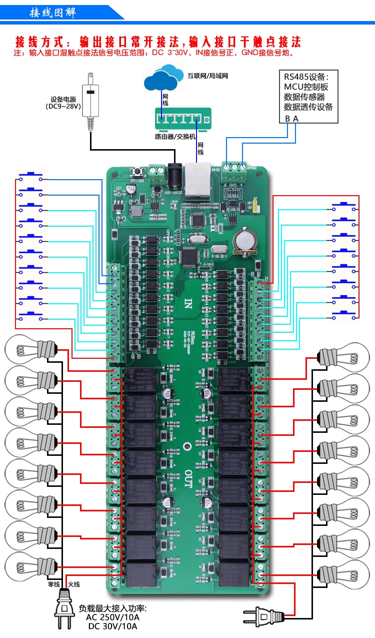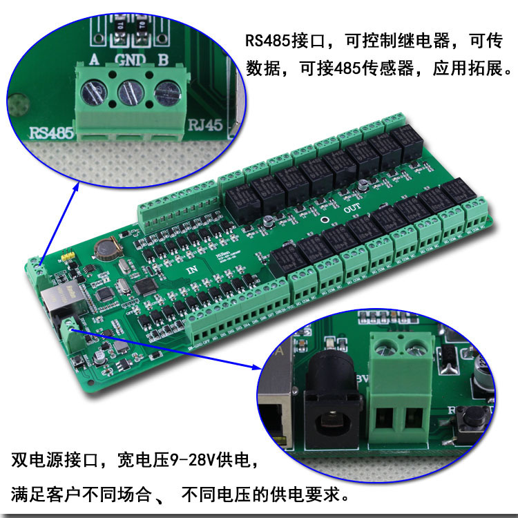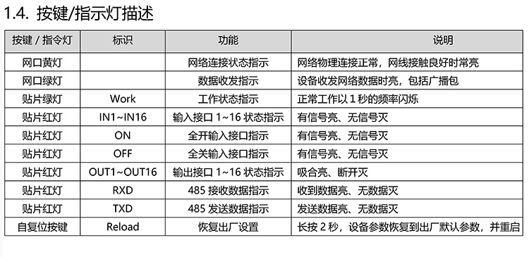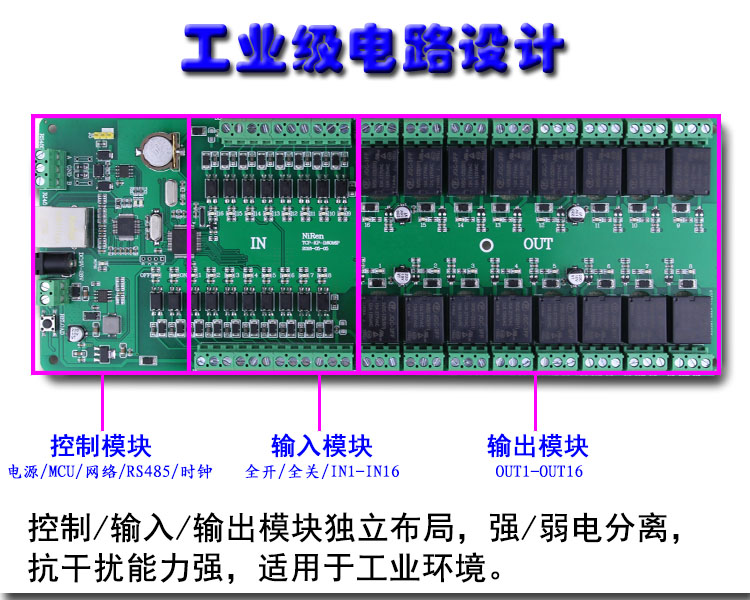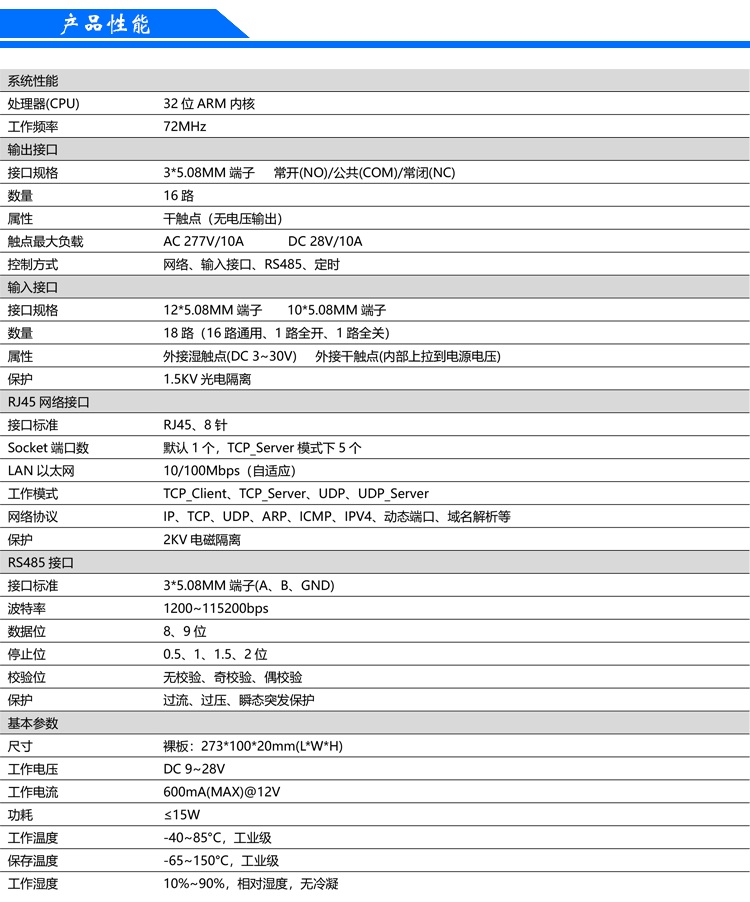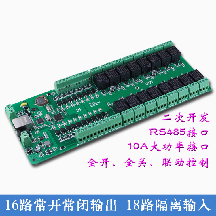 ??? 設(shè)備采用工業(yè)級設(shè)計(jì)方案,搭載32 ARM 處理器和10/100M 以太網(wǎng)網(wǎng)絡(luò)方案,具有速度快,運(yùn)算能力強(qiáng),穩(wěn)定性高,抗干擾能力強(qiáng)等特點(diǎn),滿足工業(yè)環(huán)境使用要求。設(shè)備有16 路繼電器輸出、18 路開關(guān)量隔離輸入和1 RS485 接口,繼電器支持實(shí)時(shí)控制、延時(shí)控制、輸入輸出聯(lián)動(dòng)控制、一鍵全開全關(guān)控制、日循環(huán)定時(shí)控制和自定義日期控制等多種控制方式,開關(guān)量輸入狀態(tài)支持被動(dòng)上傳、定時(shí)上傳和觸發(fā)上傳,RS485 接口支持用于控制設(shè)備或傳輸數(shù)據(jù),以滿足更多不同的場合使用,滿足更多用戶的使用需求。