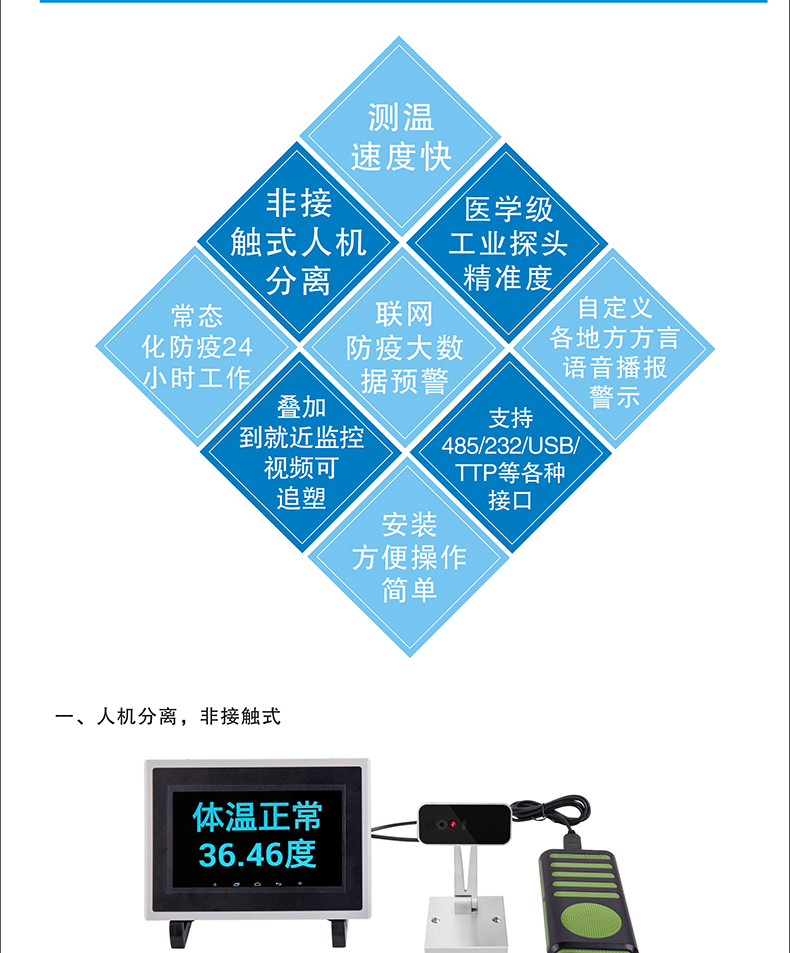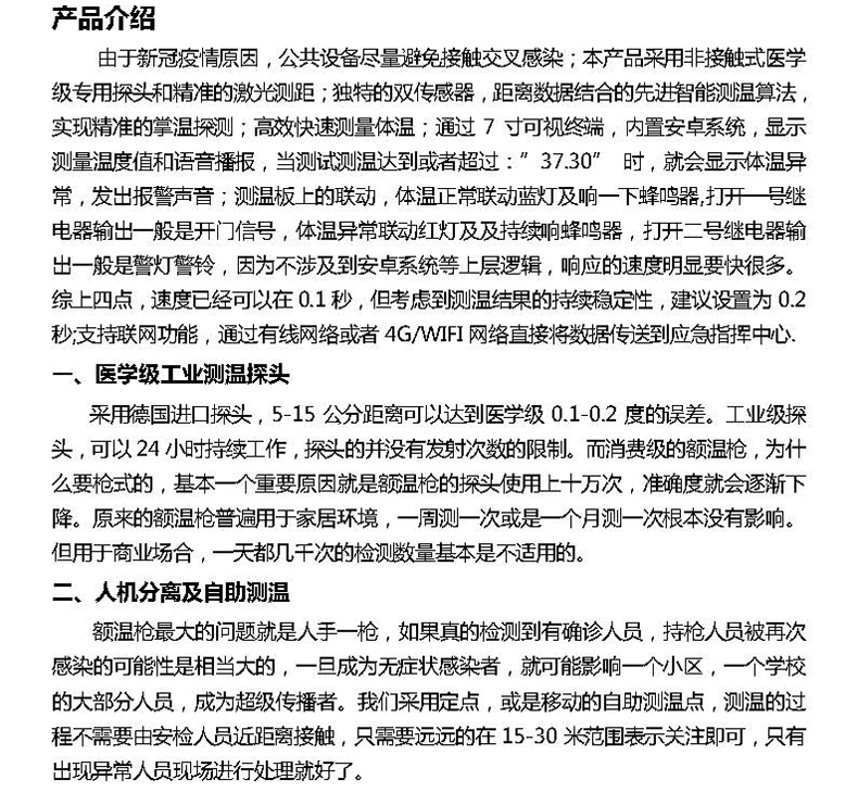 由于新冠疫情原因,公共設(shè)備盡量避免接觸交叉感染;本產(chǎn)品采用非接觸式醫(yī)學(xué)級(jí)專(zhuān)用探頭和精準(zhǔn)的激光測(cè)距;獨(dú)特的雙傳感器,距離數(shù)據(jù)結(jié)合的先進(jìn)智能測(cè)溫算法,實(shí)現(xiàn)精準(zhǔn)的掌溫探測(cè);高效快速測(cè)量體溫;通過(guò)7寸可視終端,內(nèi)置安卓系統(tǒng),顯示測(cè)量溫度值和語(yǔ)音播報(bào),當(dāng)測(cè)試測(cè)溫達(dá)到或者超過(guò):”37.30”