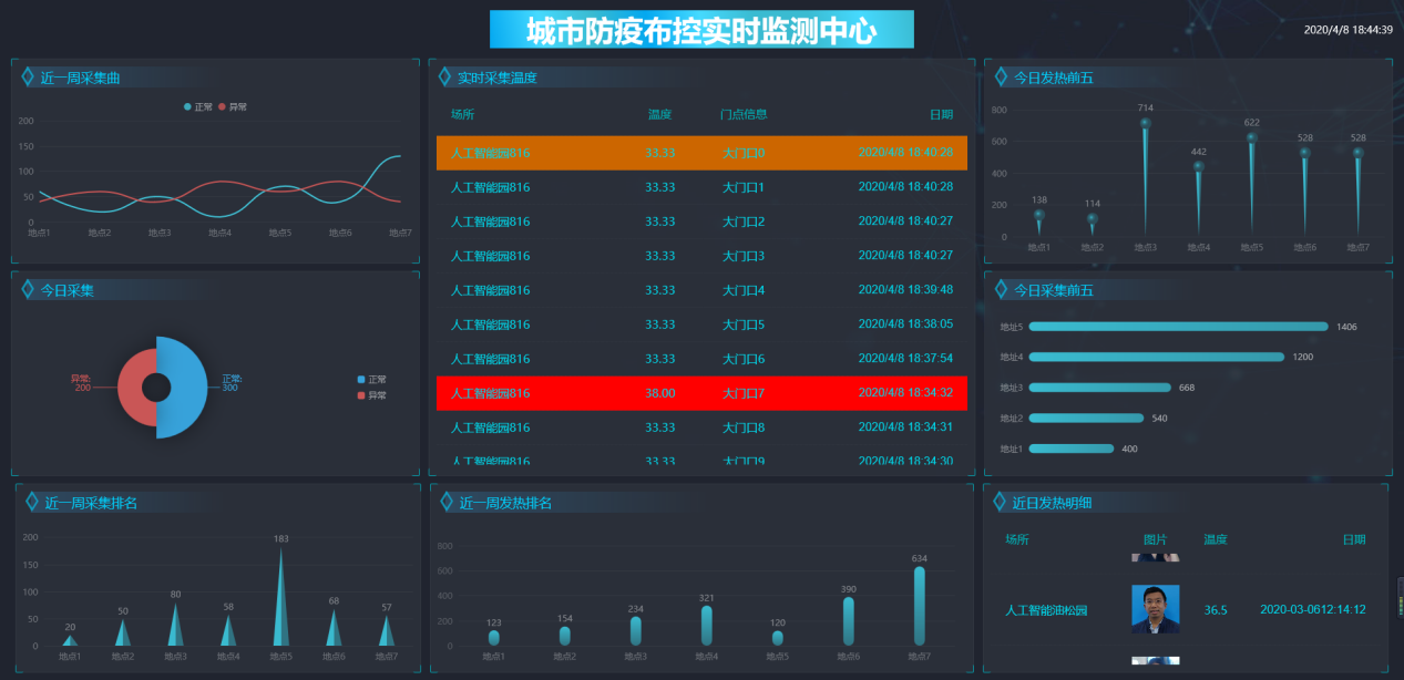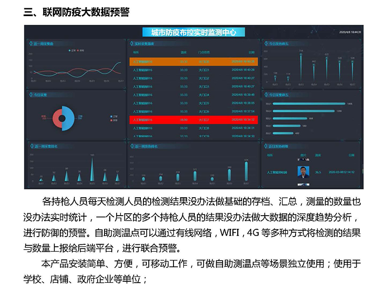 各持槍人員每天檢測(cè)人員的檢測(cè)結(jié)果沒(méi)辦法做基礎(chǔ)的存檔、匯總,測(cè)量的數(shù)量也沒(méi)辦法實(shí)時(shí)統(tǒng)計(jì),一個(gè)片區(qū)的多個(gè)持槍人員的結(jié)果沒(méi)辦法做大數(shù)據(jù)的深度趨勢(shì)分析,進(jìn)行防御的預(yù)警。自助測(cè)溫點(diǎn)可以通過(guò)有線(xiàn)網(wǎng)絡(luò),WIFI,4G等多種方式將檢測(cè)的結(jié)果與數(shù)量上報(bào)給后端平臺(tái),進(jìn)行聯(lián)合預(yù)警。