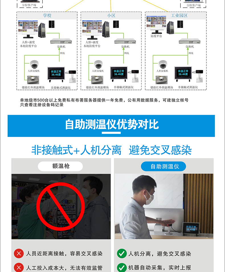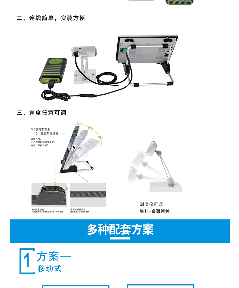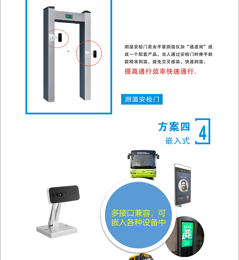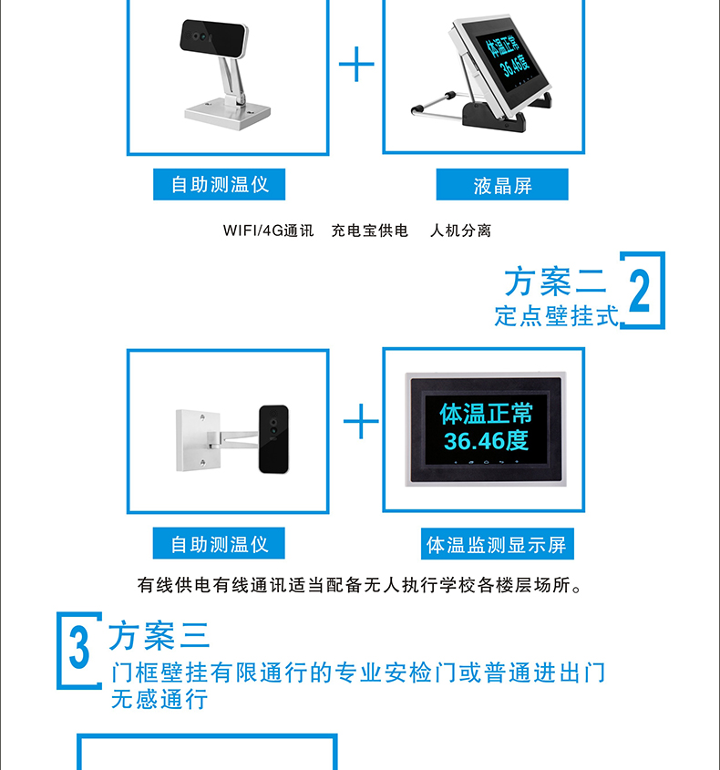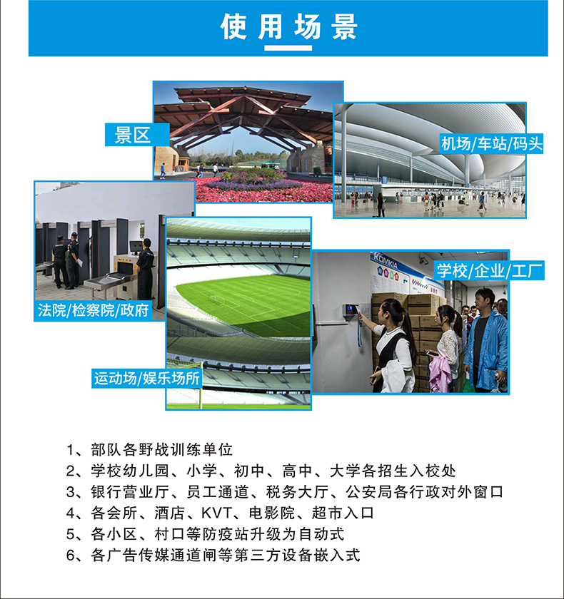 本產(chǎn)品安裝簡(jiǎn)單、方便,可移動(dòng)工作,可做自助測(cè)溫點(diǎn)等場(chǎng)景獨(dú)立使用;使用于學(xué)校、店鋪、政府企業(yè)等單位;