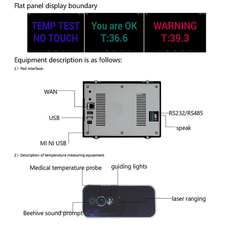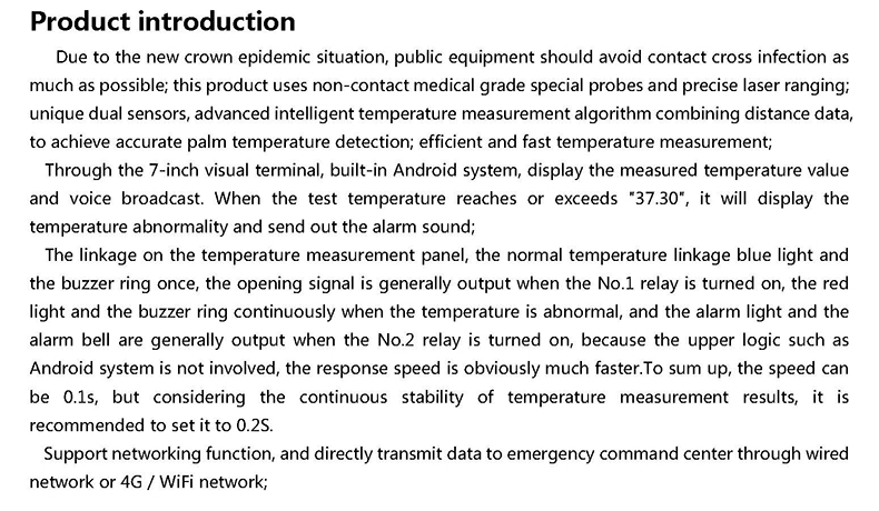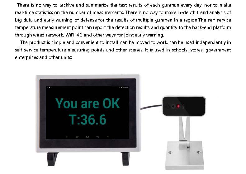 Through the 7-inch visual terminal, built-in Android system, display the measured temperature value and voice broadcast. When the test temperature reaches or exceeds "37.30", it will display the temperature abnormality and send out the alarm sound;