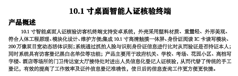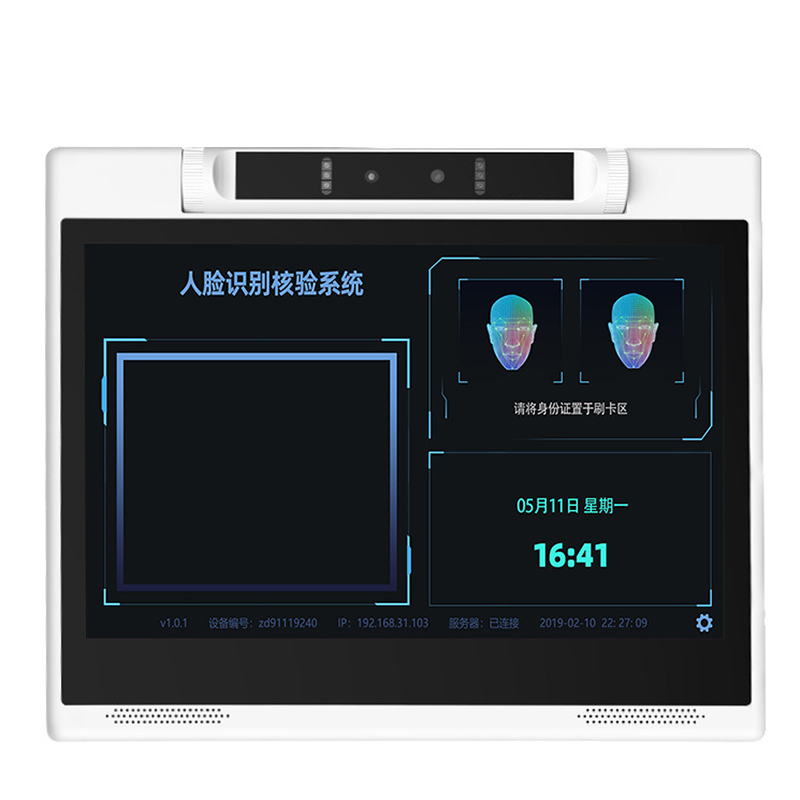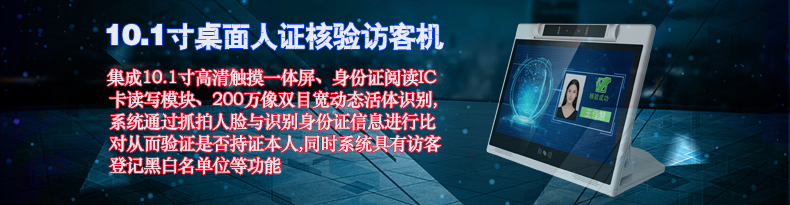 10.1寸智能桌面人證核驗訪客機終端支持安卓系統(tǒng),外殼采用塑料材質(zhì)、重量輕、外形美觀、符合人體工程原理、模塊化設(shè)計、維護方便;集成10.1寸高清觸摸一體屏、身份證閱讀IC卡讀寫模塊、200萬像雙目寬動態(tài)活體識別;系統(tǒng)通過抓拍人臉與識別身份證信息進行比對從而驗證是否持證本人;同時系統(tǒng)具有訪客登記黑白名單位等功能;產(chǎn)品主要用于政府機關(guān)、學(xué)校、考場、花園小區(qū)、高檔寫字樓、酒店等場所的門衛(wèi)傳達室大廳接待處對進出人員信息化登記人證核驗,從而代替了傳統(tǒng)的手工登記,有效的提高了工作效率及證件信息登記準確性,使日后的信息查詢工作更方便更快捷。