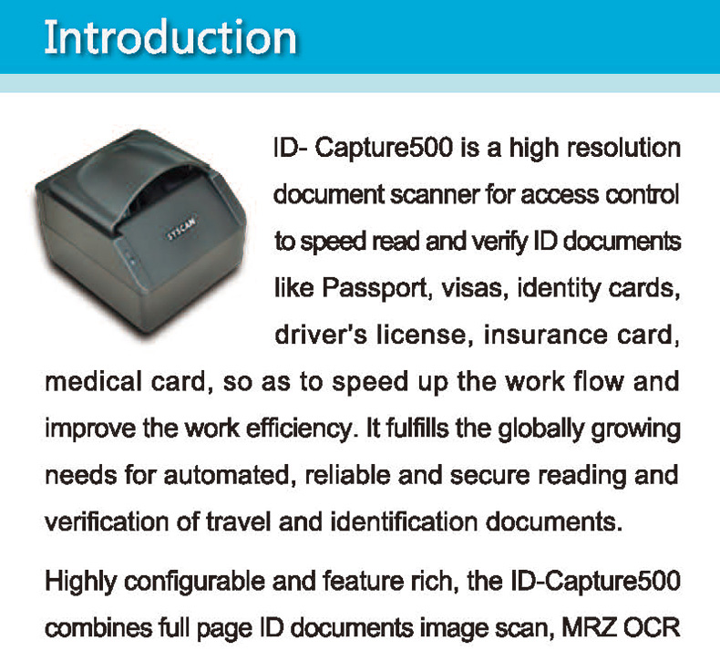 Embedded ID- Capture500 is specially designed for embedding into kinds of kiosks, easy to integrate, automatically reading and high speed.
