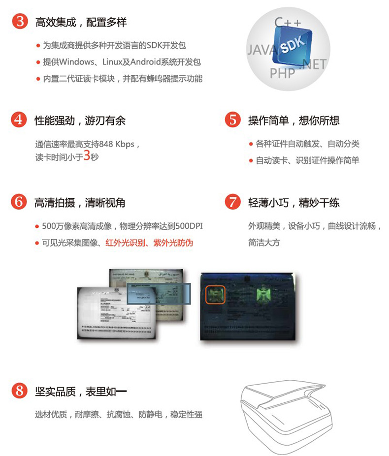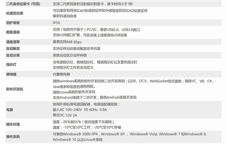 4)?? 高效集成,配置多樣:為集成商提供多種開發(fā)語言的 SDK 開發(fā)包;并且提供 Windows以及 Linux 下的開發(fā)包,同時內置二代證讀卡模塊,并配有蜂鳴器提示功能;
