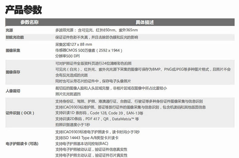 支持身份證、駕照、護照、港澳通行證、臺胞證、行駛證等多種身份證件圖像采集與信息識別 支持ICAO9303標準護照、簽證等旅行證件的圖像采集與信息識別,包含機讀碼和其他版面信息 支持識讀1D條形碼,Code 128, Code 39,EAN-13 等 支持識讀2D條碼,PDF417,QR,DataMatrix? 等 拍照識別速度小于 1 秒 |