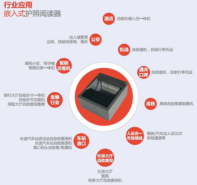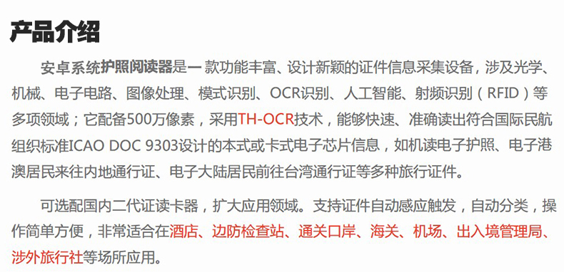 ? ? ? ?安卓護照閱讀機是一款功能豐富、設計新穎的證件信息采集設備,涉及光學、機械、電子電路、圖 像處理、模式識別、OCR 識別、人工智能、射頻識別(RFID)等多項領域;它配備 500 萬像素,采用 TH-OCR 技術,能夠快速、準確讀出符合國際民航組織標準 ICAO DOC 9303 設計的本式或卡式電子芯片信息,如機讀電子護照、電子港奧居民來往內地通行證、電子大陸居民前往臺灣通行證等多種旅行證件。