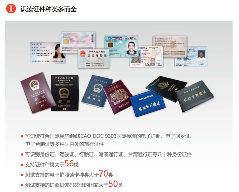 1)?? 識讀種證種類多而全:可識讀符合國際民航組織 ICAO DOC 9303 國際標準的電子護照、電子回鄉(xiāng)證、電子臺胞證等多種國內外的旅行證件;還可以識別身份證、駕駛證、行駛證、港澳通行證、臺灣通行證等幾十種身份證件;