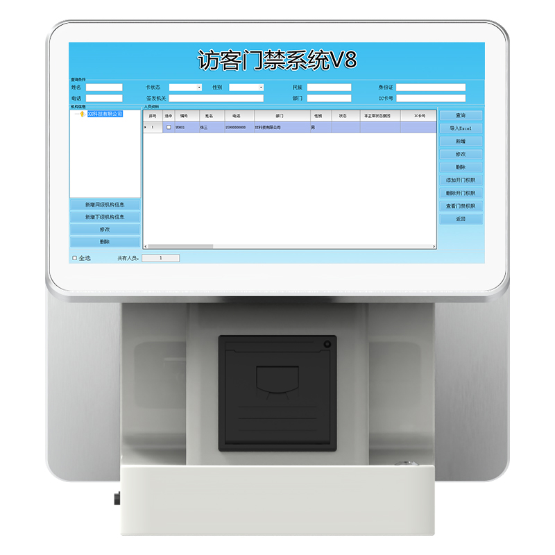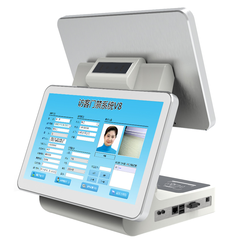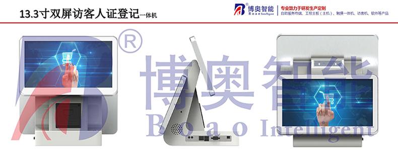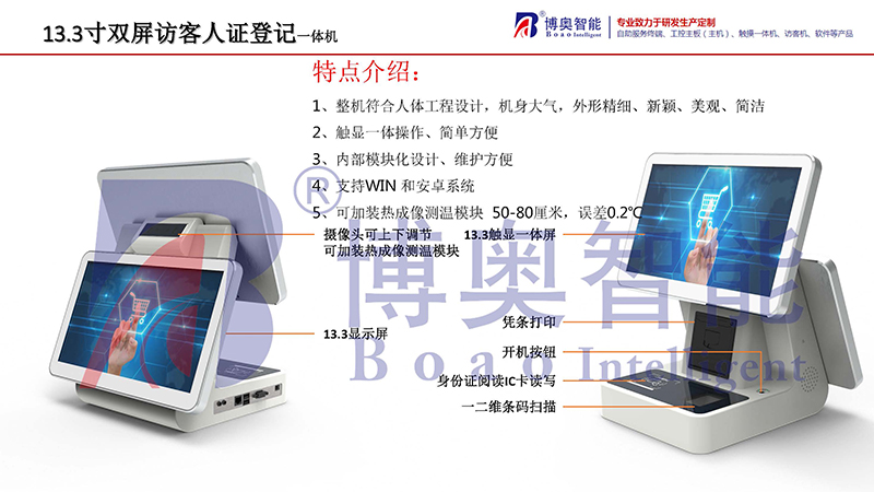 BA-FK13A訪客機(jī)是博奧智能針對(duì)政府機(jī)關(guān)、軍隊(duì)、公安、法院、學(xué)校、事業(yè)單位、花園小區(qū)、高檔寫(xiě)字樓、工廠等門(mén)衛(wèi)傳達(dá)室設(shè)計(jì)加工的一款進(jìn)出人員信息化登記設(shè)備, 從而代替了傳統(tǒng)的手工登記,有效的提高了門(mén)衛(wèi)管理工作效率及證件信息登記準(zhǔn)確性, 為日后的信息查詢工作更方便量更快捷。整機(jī)采用流線性設(shè)計(jì),符合人體工程原理,結(jié)構(gòu)合理,外形美觀大方,操作簡(jiǎn)單,維護(hù)方便;內(nèi)部采用模塊化設(shè)計(jì),集成13.3寸電容觸顯一體屏和13.3寸液晶屏、身份證閱讀器,IC卡讀寫(xiě)器、雙目寬動(dòng)態(tài)高清攝像頭、條碼掃描儀、熱敏打印機(jī)及熱成像測(cè)溫等模塊。