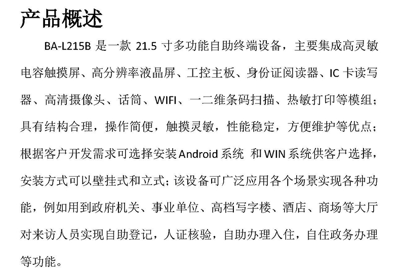 BA-L215B是一款21.5寸多功能自助終端設備,主要集成高靈敏電容觸摸屏、高分辨率液晶屏、工控主板、身份證閱讀器、IC卡讀寫器、高清攝像頭、話筒、WIFI、一二維條碼掃描、熱敏打印等模組;具有結構合理,操作簡便,觸摸靈敏,性能穩(wěn)定,方便維護等優(yōu)點;根據客戶開發(fā)需求可選擇安裝Android系統(tǒng) 和WIN系統(tǒng),安裝方式分為壁掛式和立式;該設備可廣泛應用各個場景實現(xiàn)各種功能,例如用到政府機關、事業(yè)單位、高檔寫字樓、酒店、商場等大廳對來訪人員實現(xiàn)自助登記,人證核驗,自助辦理入住,自住政務辦理等功能。