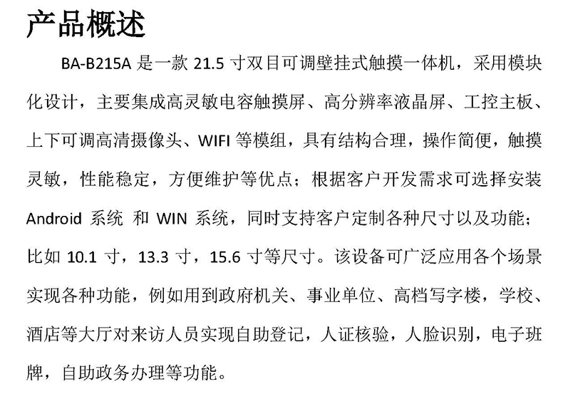 BA-B215A是一款21.5寸雙目可調(diào)壁掛式觸摸一體機(jī),采用模塊化設(shè)計(jì),主要集成高靈敏電容觸摸屏、高分辨率液晶屏、工控主板、上下可調(diào)高清攝像頭、WIFI等模組,具有結(jié)構(gòu)合理,操作簡(jiǎn)便,觸摸靈敏,性能穩(wěn)定,方便維護(hù)等優(yōu)點(diǎn);根據(jù)客戶開發(fā)需求可選擇安裝Android系統(tǒng) 和WIN系統(tǒng),同時(shí)支持客戶定制各種尺寸以及功能;比如10.1寸,13.3寸,15.6寸等尺寸。該設(shè)備可廣泛應(yīng)用各個(gè)場(chǎng)景實(shí)現(xiàn)各種功能,例如用到政府機(jī)關(guān)、事業(yè)單位、高檔寫字樓,學(xué)校、酒店等大廳對(duì)來訪人員實(shí)現(xiàn)自助登記,人證核驗(yàn),人臉識(shí)別,電子班牌,自助政務(wù)辦理等功能。