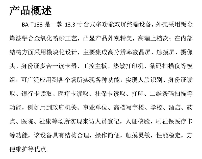 BA-T133是一款13.3寸臺式多功能雙屏終端設(shè)備,外殼采用鈑金烤漆鋁合金氧化噴砂工藝,凸顯產(chǎn)品外觀精美,高端上檔次;在內(nèi)部結(jié)構(gòu)方面采用模塊化設(shè)計(jì),主要集成高分辨率液晶屏、觸摸屏,攝像頭、身份證多合一讀卡器、工控主板、熱敏打印機(jī)、條碼掃描儀等模組,可廣泛應(yīng)用到各個(gè)場所實(shí)現(xiàn)各種功能,實(shí)現(xiàn)人臉識別、身份證讀取、銀行卡讀取、醫(yī)療卡讀取、社??ㄗx取、打印、二維條碼掃描等功能,例如用到政府機(jī)關(guān)、事業(yè)單位、高檔寫字樓、學(xué)校、酒店、藥點(diǎn)、醫(yī)院、社康等場所實(shí)現(xiàn)來訪人員登記,人證核驗(yàn),刷社保醫(yī)療卡等功能,該設(shè)備具有結(jié)構(gòu)合理,操作簡便,觸摸靈敏,性能穩(wěn)定,方便維護(hù)等優(yōu)點(diǎn).