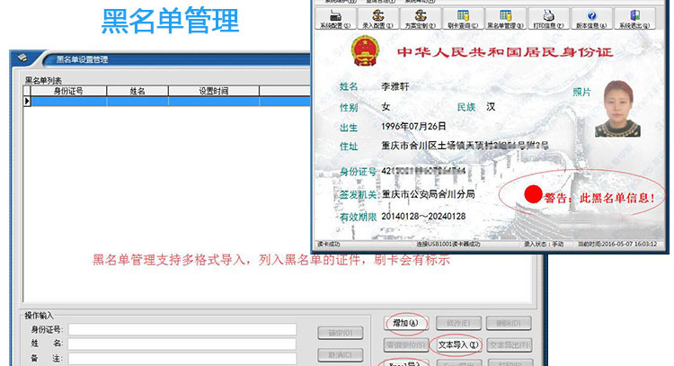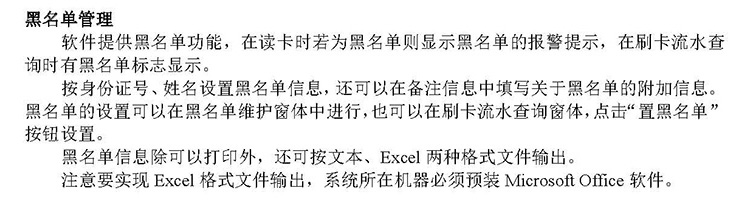 軟件提供黑名單功能,在讀卡時(shí)若為黑名單則顯示黑名單的報(bào)警提示,在刷卡流水查詢時(shí)有黑名單標(biāo)志顯示。