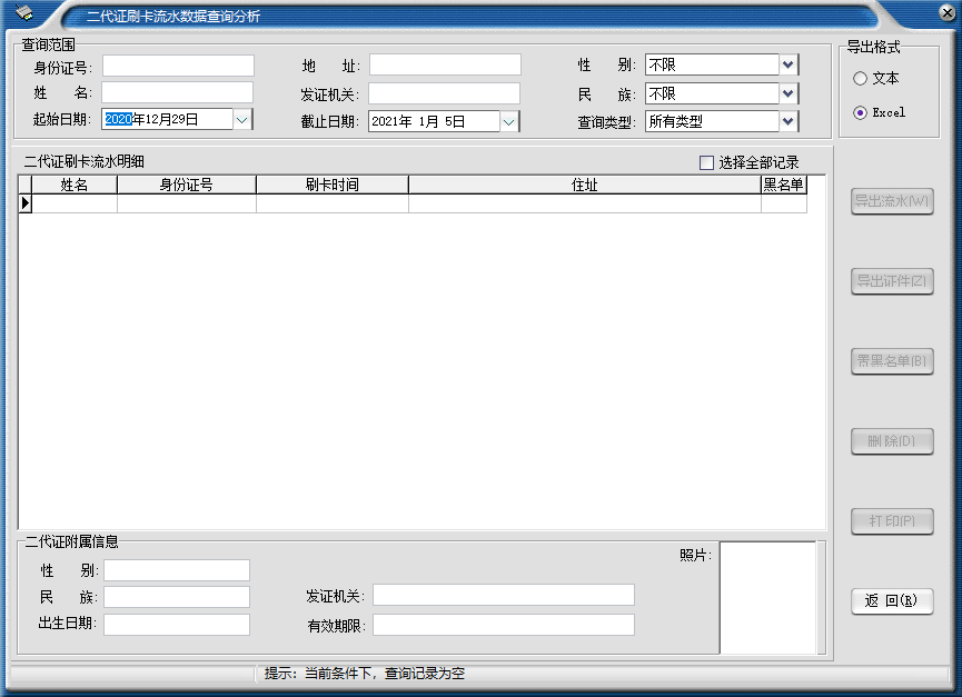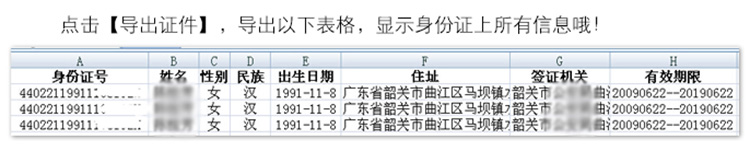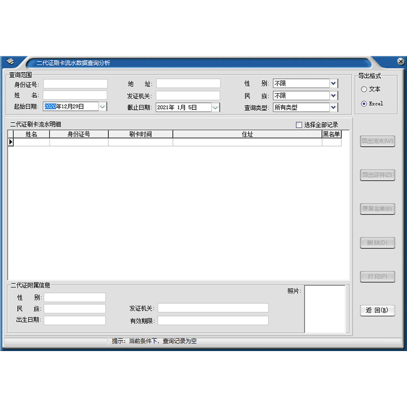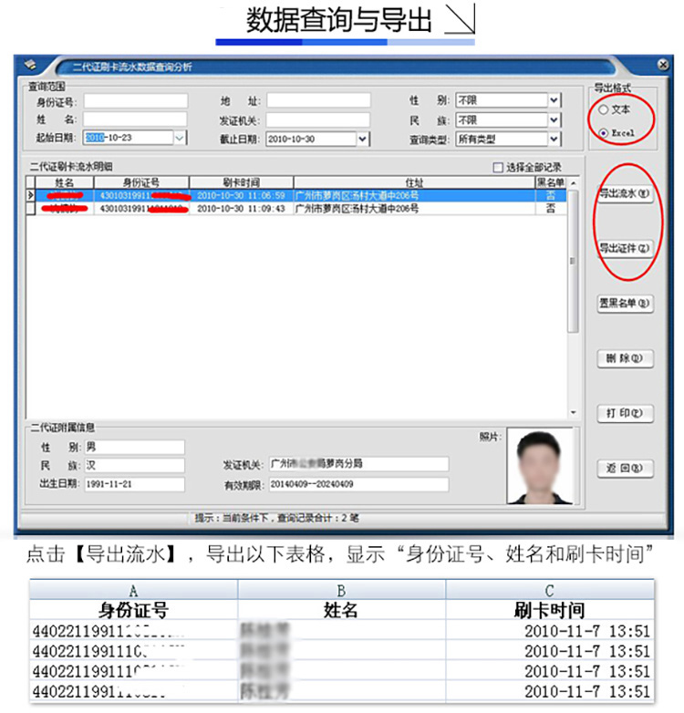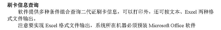 軟件提供多種條件組合查詢二代證刷卡信息,可以打印外,還可按文本、Excel兩種格式文件輸出。
