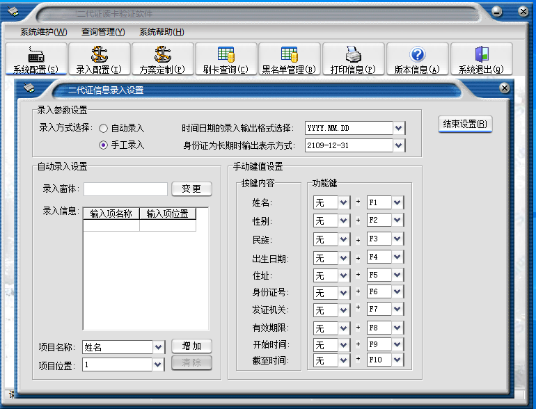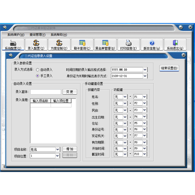 選擇手動(dòng)方式時(shí),可按需要調(diào)整設(shè)置各項(xiàng)身份證信息對(duì)應(yīng)的熱鍵定義。