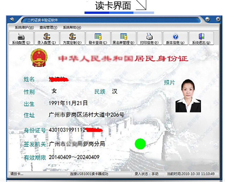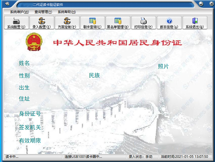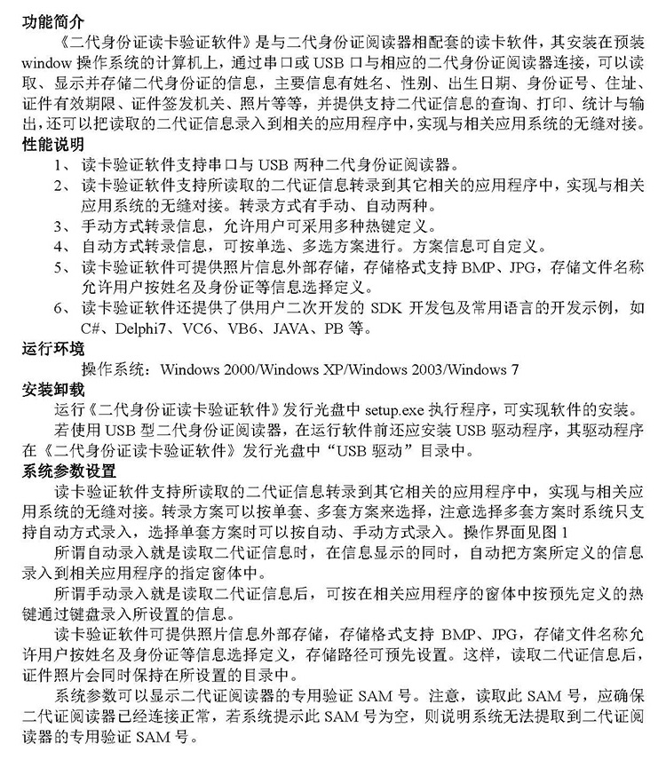 《二代身份證讀卡驗(yàn)證軟件》是與二代身份證閱讀器相配套的讀卡軟件,其安裝在預(yù)裝window操作系統(tǒng)的計(jì)算機(jī)上,通過(guò)串口或USB口與相應(yīng)的二代身份證閱讀器連接,可以讀取、顯示并存儲(chǔ)二代身份證的信息,主要信息有姓名、性別、出生日期、身份證號(hào)、住址、證件有效期限、證件簽發(fā)機(jī)關(guān)、照片等等,并提供支持二代證信息的查詢、打印、統(tǒng)計(jì)與輸出,還可以把讀取的二代證信息錄入到相關(guān)的應(yīng)用程序中,實(shí)現(xiàn)與相關(guān)應(yīng)用系統(tǒng)的無(wú)縫對(duì)接。