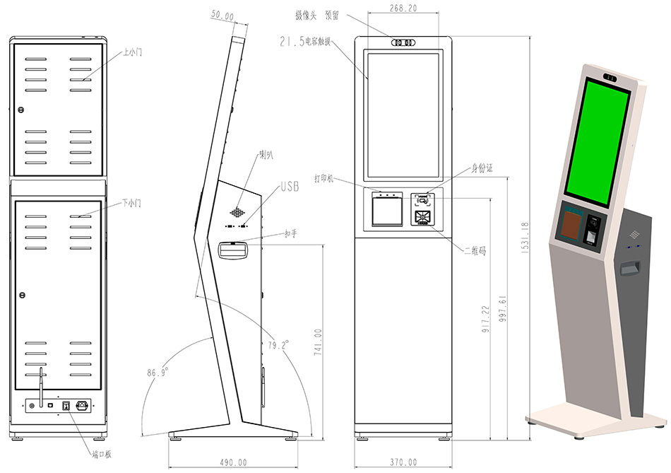 21.5寸多功能一體采用鈑金外殼,表面烤漆工藝,外觀精致;結(jié)構(gòu)設(shè)計(jì)合理,易操作,方便維護(hù),主要集成21.5寸觸摸一體屏,雙目攝像頭,身份證閱讀器,IC卡讀器,打印機(jī),條碼掃描等模塊,產(chǎn)品支持功能定制及結(jié)構(gòu)外觀設(shè)計(jì);多功能一體機(jī)可用于各種場(chǎng)景做為訪客登記系統(tǒng),人證比對(duì)系統(tǒng),排隊(duì)叫號(hào)系統(tǒng);比如門衛(wèi),辦事大廳醫(yī)院等。為了方便代理加盟和系統(tǒng)集成商應(yīng)用,產(chǎn)品可整機(jī)和套件銷售,客戶根據(jù)需求可選安卓系統(tǒng)和WIN系統(tǒng)