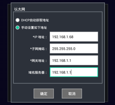 終端網(wǎng)絡配置可以選擇以太網(wǎng)、WiFi和移動網(wǎng)絡中的一種并配置相應的參數(shù)。以太網(wǎng)設置界面如下圖所示,可以選擇DHCP自動獲取地址(局域網(wǎng)中有DHCP服務器則建議使用)或者手動設置如下地址(局域網(wǎng)中午DHCP服務器或者不允許使用動態(tài)地址時使用)。