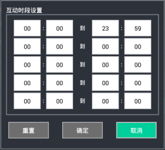 互動時段設置界面如下圖所示,最多可設置五個終端機的互動時段,00:00~00:00表示空配置項,00:00~23:59表示全天均可互動。終端機只有在配置的互動時段內才可以通過交互觸發(fā)互動節(jié)目的播放。