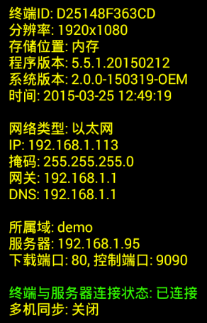 BA-iDS6終端軟件內置安裝在安卓主板上,主板開機后自動運行終端程序進入播放狀態(tài)。按遙控器的INFO鍵,或快速點擊屏幕任意一個角落四次,可呼出如下圖所示的終端運行狀態(tài)信息,包括終端ID、分辨率、節(jié)目存儲位置、播放程序版本、安卓系統(tǒng)版本、機器時間、網(wǎng)絡參數(shù)、服務器參數(shù)、終端到服務器的連接狀態(tài)、多級同步開關等信息。