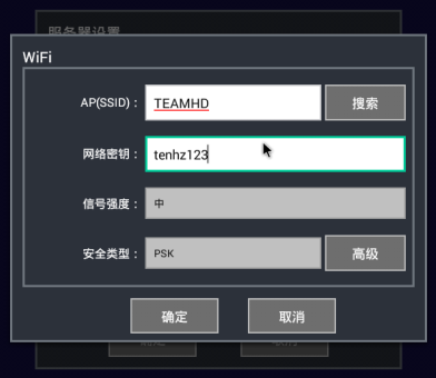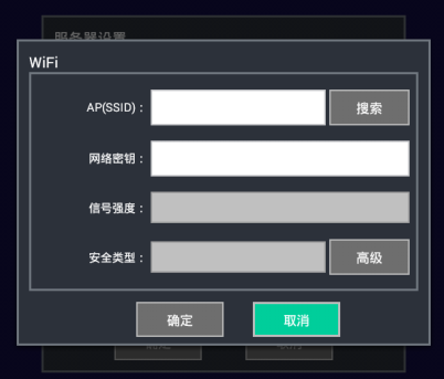 WiFi配置如下面圖片所示,可通過WiFi配置界面的搜索按鈕打開手動搜索界面,通過刷新按鈕更新無線AP列表,并在搜索結果列表中選擇合適的AP名稱(AP名稱也可以自行手動直接輸入),同時輸入相應的網(wǎng)絡密鑰即可完成WiFi的設置。如果某些AP不支持DHCP動態(tài)分配IP地址或者網(wǎng)絡環(huán)境不允許使用動態(tài)IP地址,則可通過高級按鈕進入手動設置IP地址界面(設置界面完全類似以太網(wǎng)的手動設置IP地址界面)。