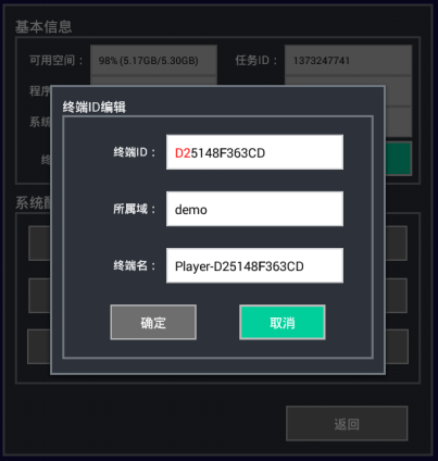 終端基本信息中的[設置]按鈕彈出界面如下圖所示,可進行終端ID、所屬域、終端名稱的編輯。終端所屬域定義了終端在服務器的在哪個域中可見,如果為空則默認為demo域。請注意:如果服務器強制將終端錄入到了某個域,則終端一旦聯(lián)網(wǎng)就會自動轉換到相應的域