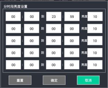 亮度設置界面如下圖所示,最多可指定5個不同時段的亮度,默認情況下全天不分時段則只需要指定第一段00:00~23:59的亮度值。亮度值通常是0最暗、10最亮,但是有些LED屏的背光電路亮暗邏輯是反的。