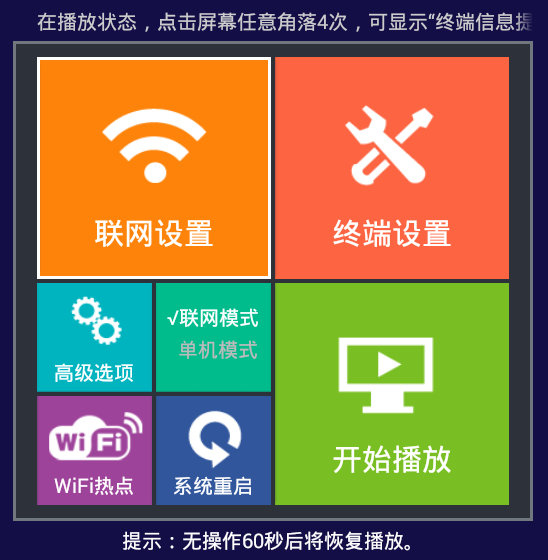 終端后臺設置界面包括7個子功能按鈕(注:若軟件界面有差異是因為未更新到最新版本,但不影響使用可以忽略):聯(lián)網(wǎng)設置、終端設置、高級選項、聯(lián)網(wǎng)/單機模式、WiFi熱點、系統(tǒng)重啟和開始播放。