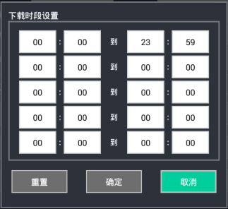 下載時段設置界面如下圖所示,最多可設置五個終端機的下載時段,00:00~00:00表示空配置項,00:00~23:59表示全天均可下載。終端機只有在配置的下載時段內才會從服務器下載同步節(jié)目內容;而配置、程序和系統(tǒng)包的下載不受下載時間限制。