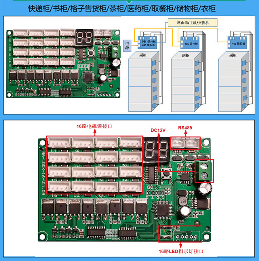 鎖控板廣泛應(yīng)用于智能快遞柜、格子售貨柜、口紅柜、儲(chǔ)物柜、設(shè)備售書(shū)機(jī)、信報(bào)箱、寄存柜、物流柜、文件柜、電表箱、更衣柜、自動(dòng)售販機(jī)、手機(jī)柜、鞋柜等集中控制箱柜。