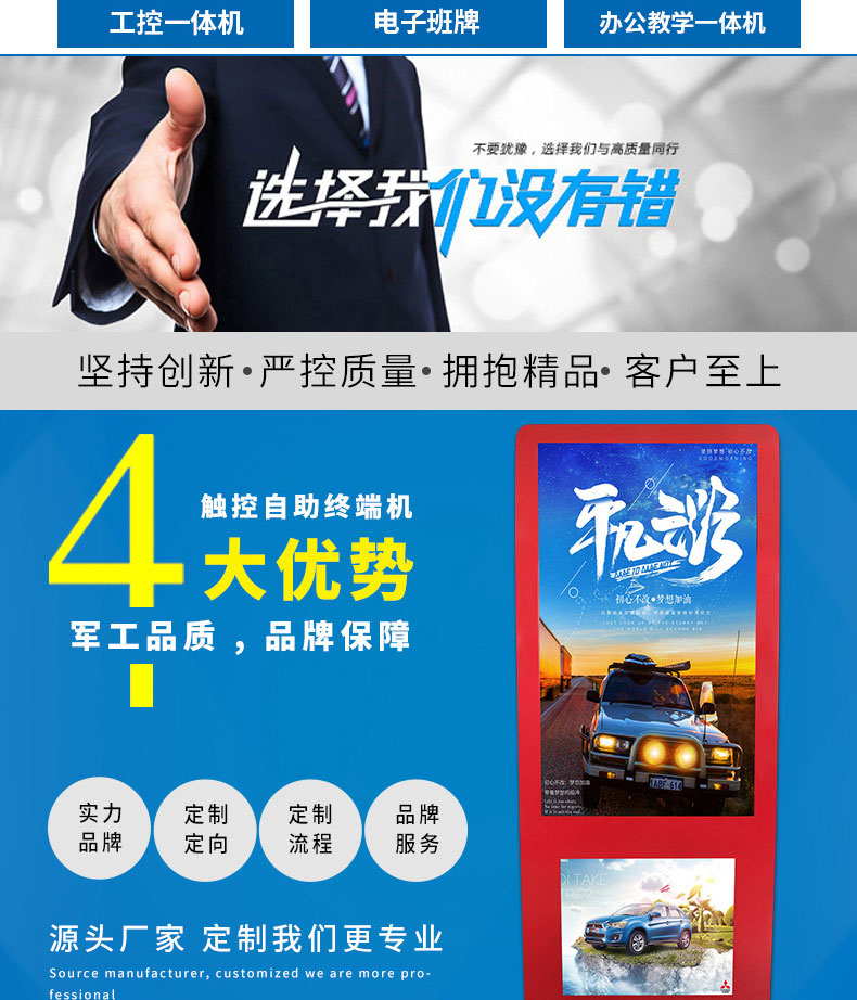 一站式解決方案供應(yīng)商,來圖來樣加工快速出樣品,提供相關(guān)硬件SDK協(xié)助開發(fā);專注觸控產(chǎn)品的設(shè)計生產(chǎn),擁有十年設(shè)計經(jīng)驗工程師、技術(shù)工程、生產(chǎn)管理人員,以高效品質(zhì)服務(wù)客戶;從供應(yīng)商的管理,配件的選型,工藝流程的管理各個環(huán)節(jié)都嚴(yán)格把關(guān),通過建立自己的產(chǎn)品質(zhì)量標(biāo)準(zhǔn)并嚴(yán)格執(zhí)行,確保產(chǎn)品質(zhì)量可靠;體驗流暢。