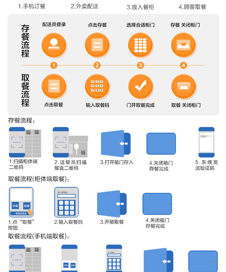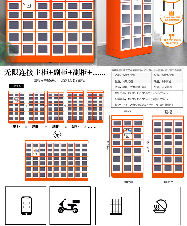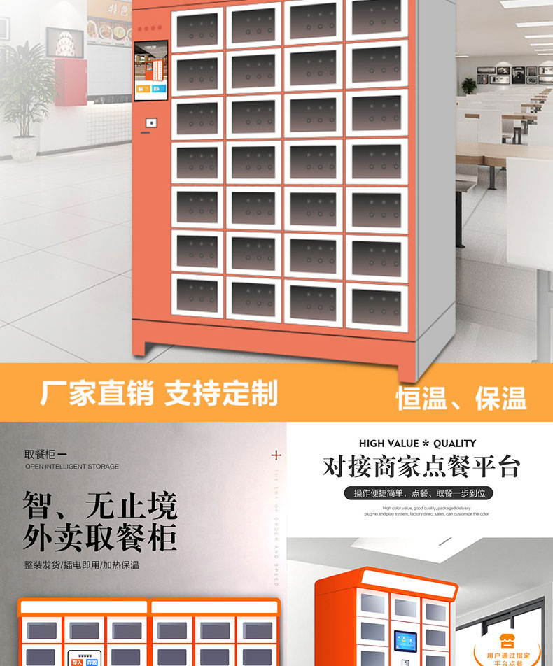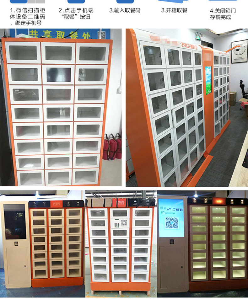 本產品應用于外賣、團餐配送、自動售賣等場景,配送人員將餐放入柜中,顧客收到取餐提示,根據自己時間取餐。柜體可實現單獨獨立加熱保溫、消毒、照明等功能,不用擔心餐變涼及安全問題,解決配送,分餐配送、分餐困難、用戶體驗差得問題。