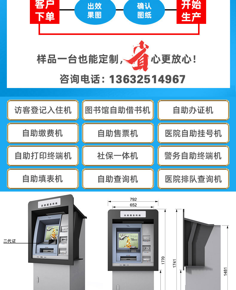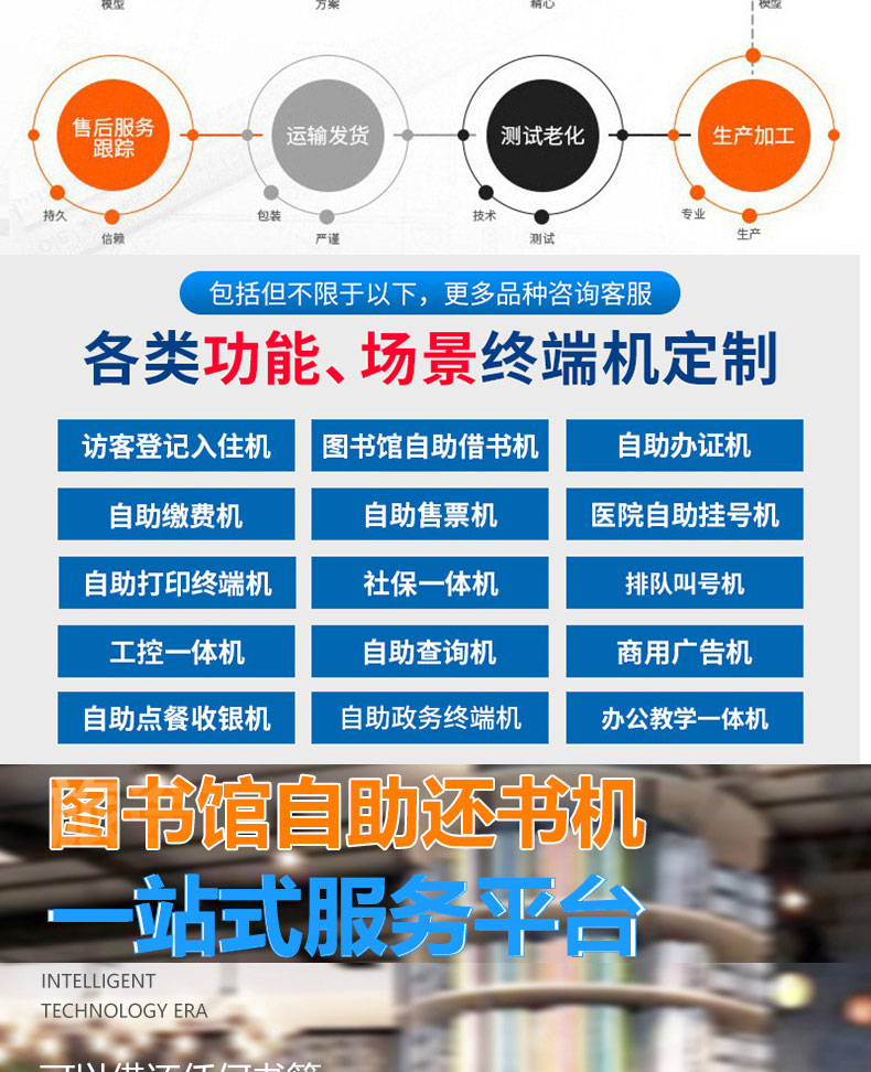 自助終端機(jī)定制:定制各種場(chǎng)景各種款式非標(biāo)終端機(jī);例如訪客機(jī)、景區(qū)自助取票機(jī)、醫(yī)院繳費(fèi)查詢機(jī)、醫(yī)院自助取單機(jī)、社保查詢機(jī)、室內(nèi)外廣告機(jī)、排隊(duì)叫號(hào)機(jī)、工控一體機(jī)、電力繳費(fèi)查詢機(jī)、圖書(shū)自助銷售機(jī)、便攜式計(jì)算機(jī)、酒店自助入住機(jī)、自助收銀機(jī)等終端。
