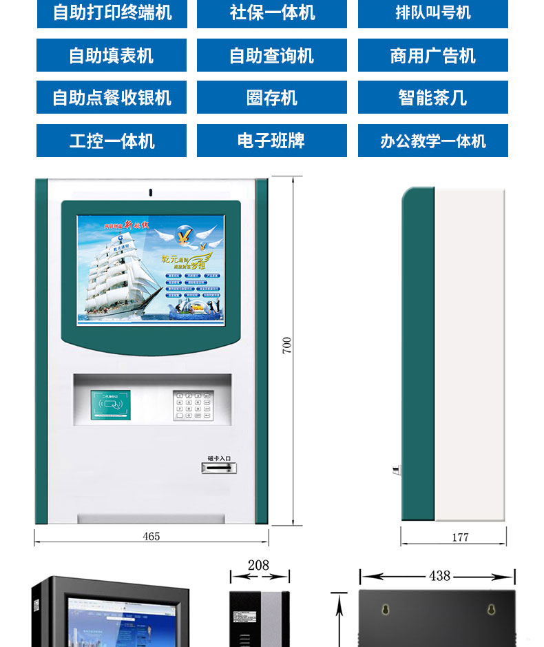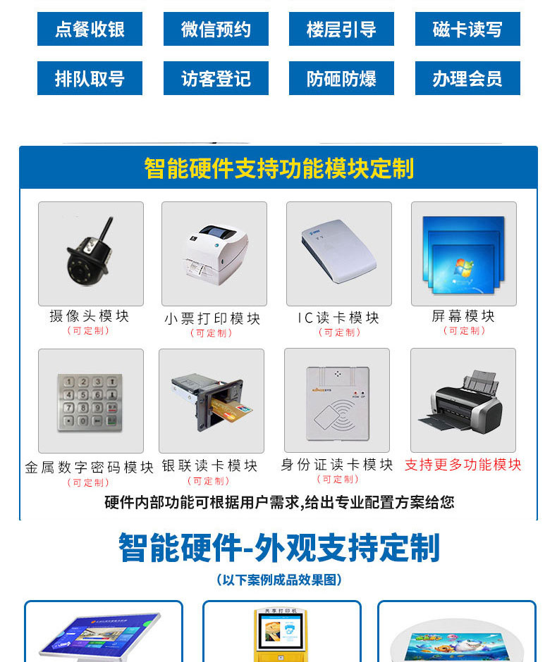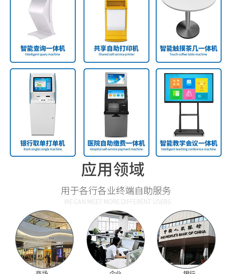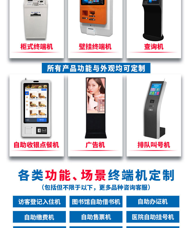 自助終端機(jī)定制:定制各種場景各種款式非標(biāo)終端機(jī);例如訪客機(jī)、景區(qū)自助取票機(jī)、醫(yī)院繳費(fèi)查詢機(jī)、醫(yī)院自助取單機(jī)、社保查詢機(jī)、室內(nèi)外廣告機(jī)、排隊(duì)叫號(hào)機(jī)、工控一體機(jī)、電力繳費(fèi)查詢機(jī)、圖書自助銷售機(jī)、便攜式計(jì)算機(jī)、酒店自助入住機(jī)、自助收銀機(jī)等終端。