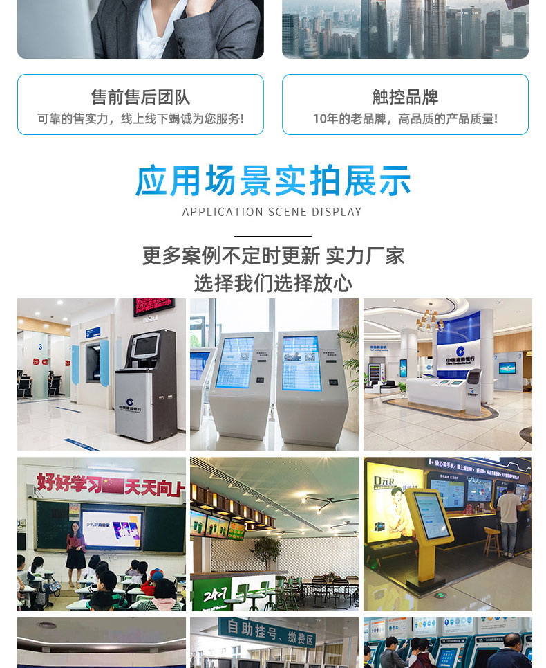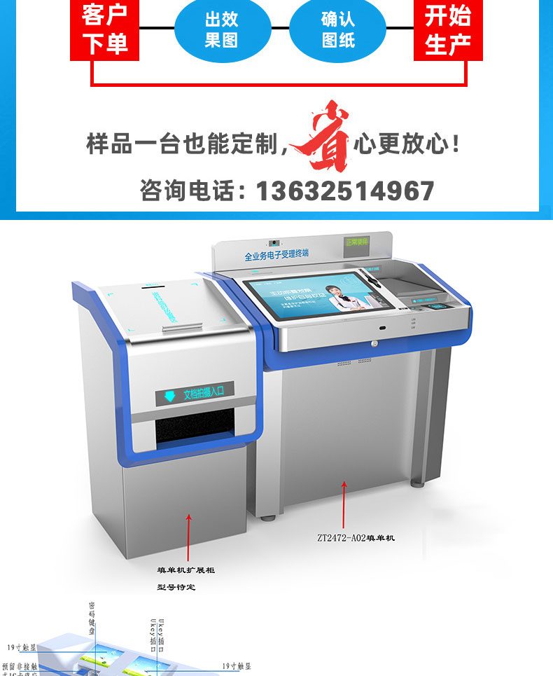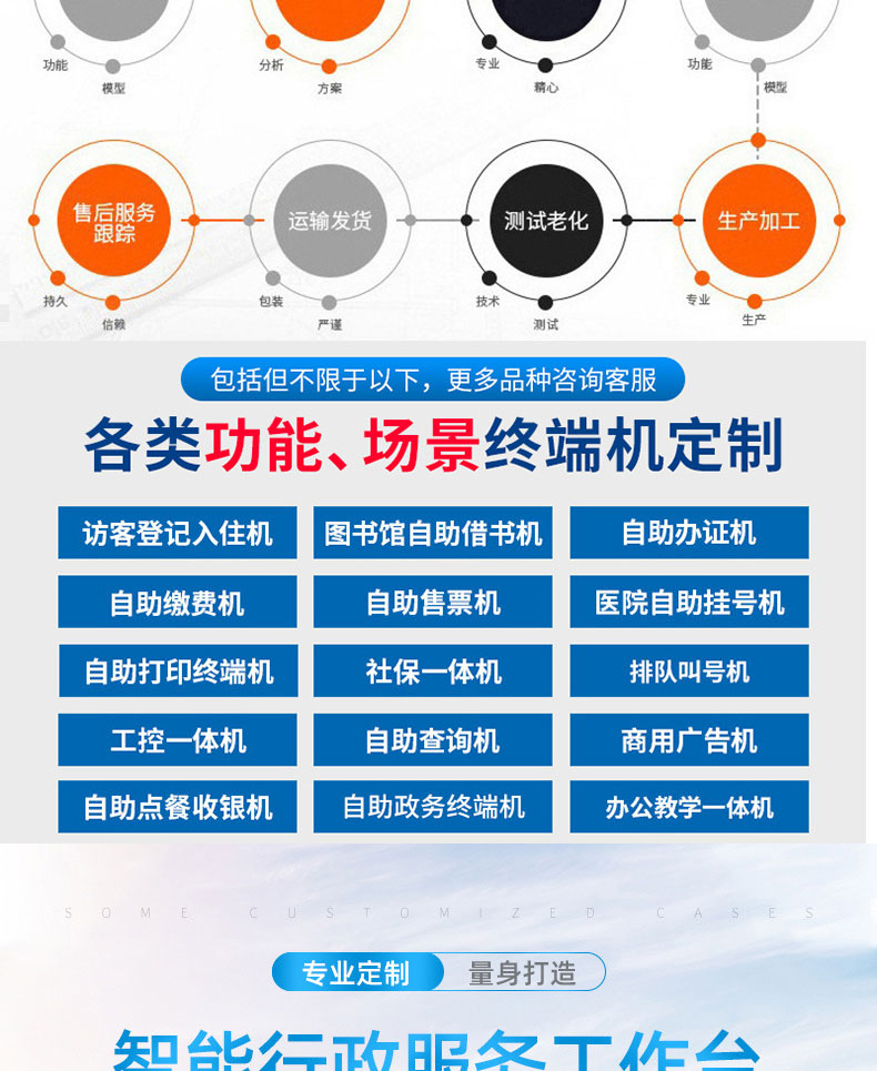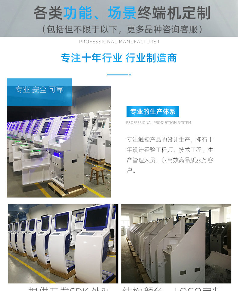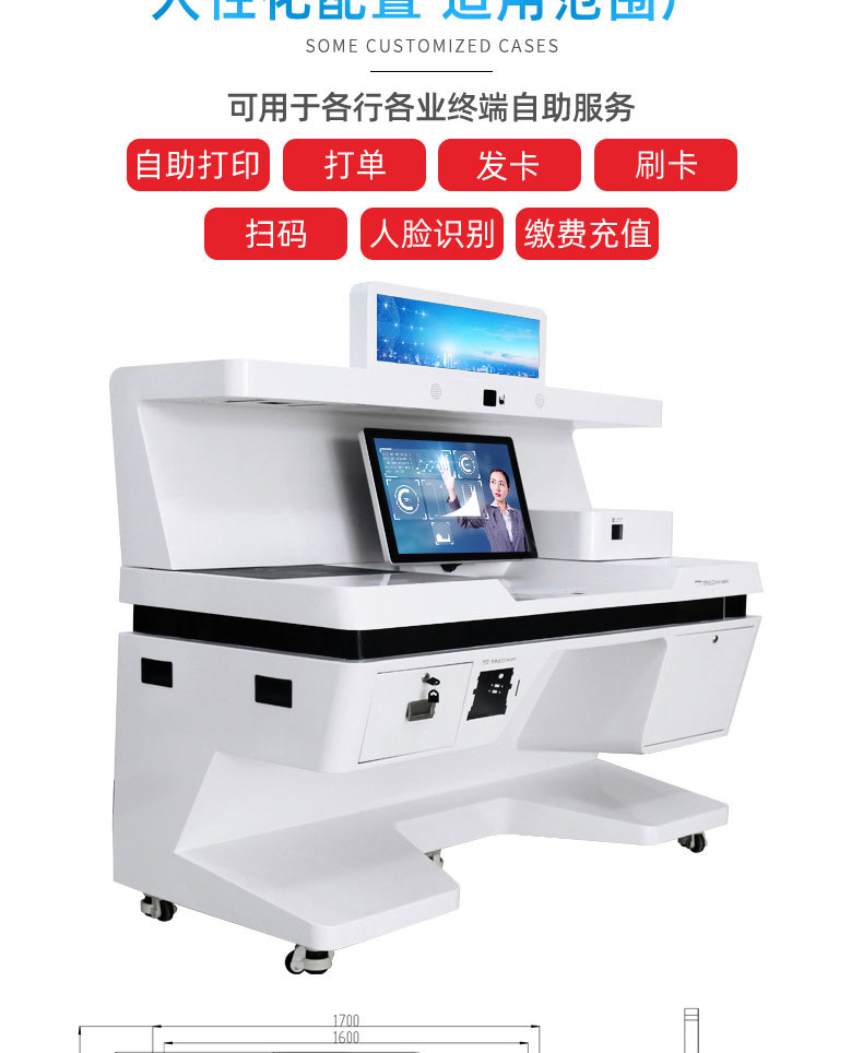 自助終端機定制:定制各種場景各種款式非標(biāo)終端機;例如訪客機、景區(qū)自助取票機、醫(yī)院繳費查詢機、醫(yī)院自助取單機、社保查詢機、室內(nèi)外廣告機、排隊叫號機、工控一體機、電力繳費查詢機、圖書自助銷售機、便攜式計算機、酒店自助入住機、自助收銀機等終端。