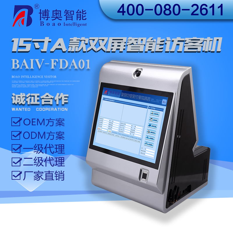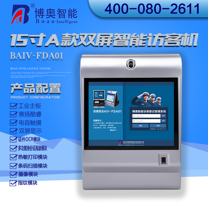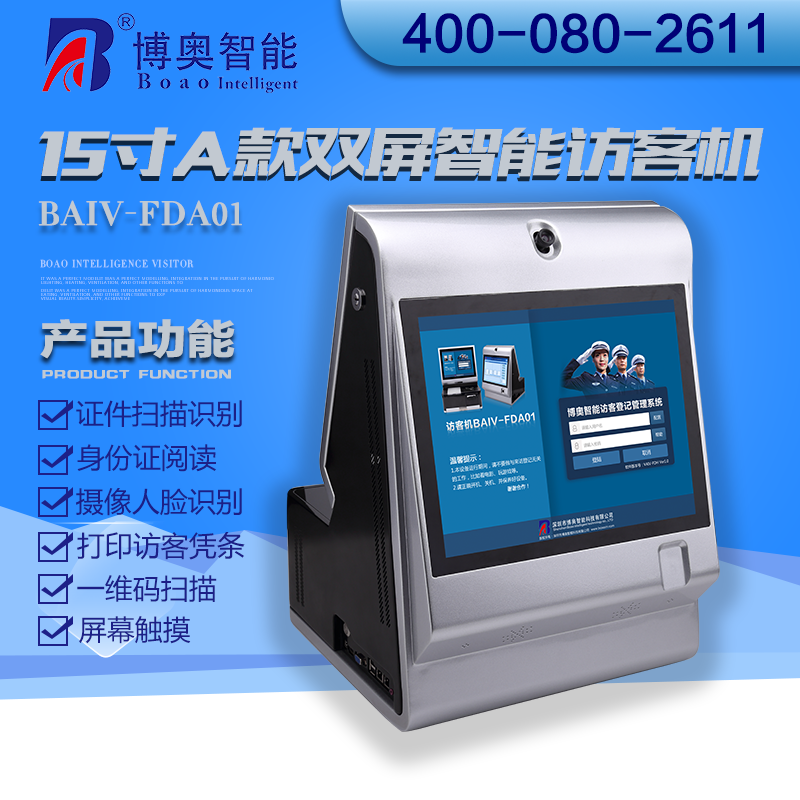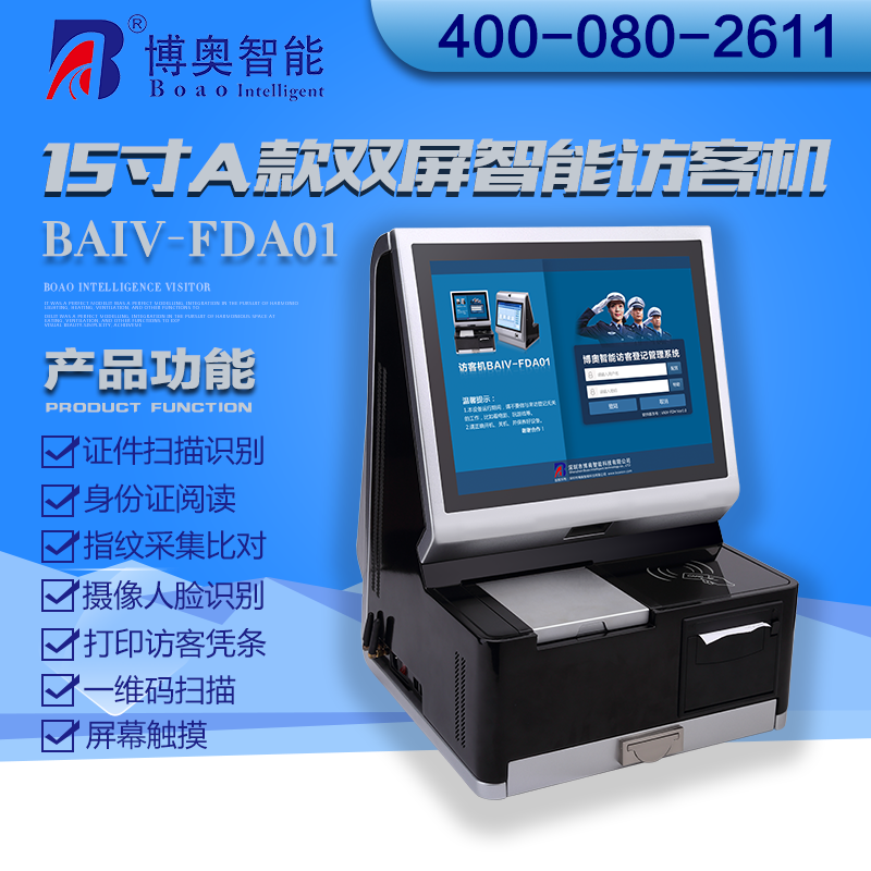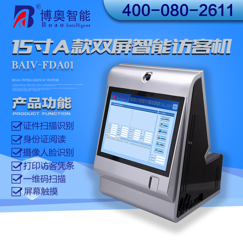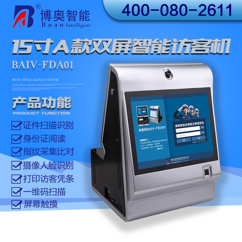 ? ? ? 15寸A款雙屏智能訪客機(jī)利用用計算機(jī)、觸摸屏手寫、證件識別(OCR),射頻識別、指紋生物識別、熱敏打印、條碼、數(shù)碼攝像、自動制證、硬件加密、網(wǎng)絡(luò)等技術(shù)實現(xiàn)智能信息化訪客登記管理,將目前手工填寫出入登記管理、電話咨詢被訪人等傳統(tǒng)方式轉(zhuǎn)變?yōu)楦呖萍嫉挠嬎銠C(jī)化、信息數(shù)字化處理,消除了手寫登記填寫時間長,容易出錯,信息缺失虛假多,不易保存,信息查詢困難等種種弊端;訪客登記管理系統(tǒng)能夠準(zhǔn)確快速的對來訪人員的證件、圖像、指紋等信息進(jìn)行識別登記并保存,以便日后查詢,同時利用聯(lián)動功能,可以對進(jìn)出車輛自動識別登記。