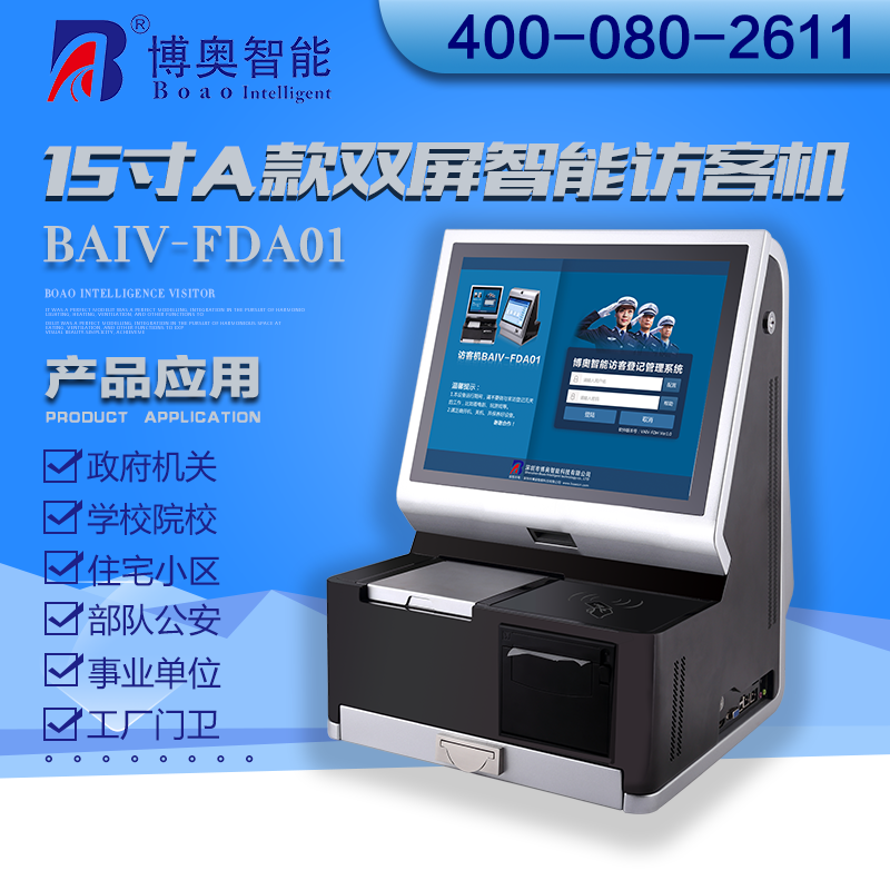 ? ? ? ?15寸A款雙屏智能訪客機(jī)主要用在政府機(jī)關(guān)、關(guān)口、機(jī)場、軍隊、公安、法院、學(xué)校、事業(yè)單位、花園小區(qū)、高檔寫字樓、工廠等門衛(wèi)傳達(dá)室用來訪客登記管理。