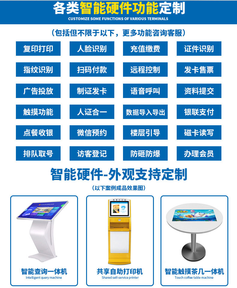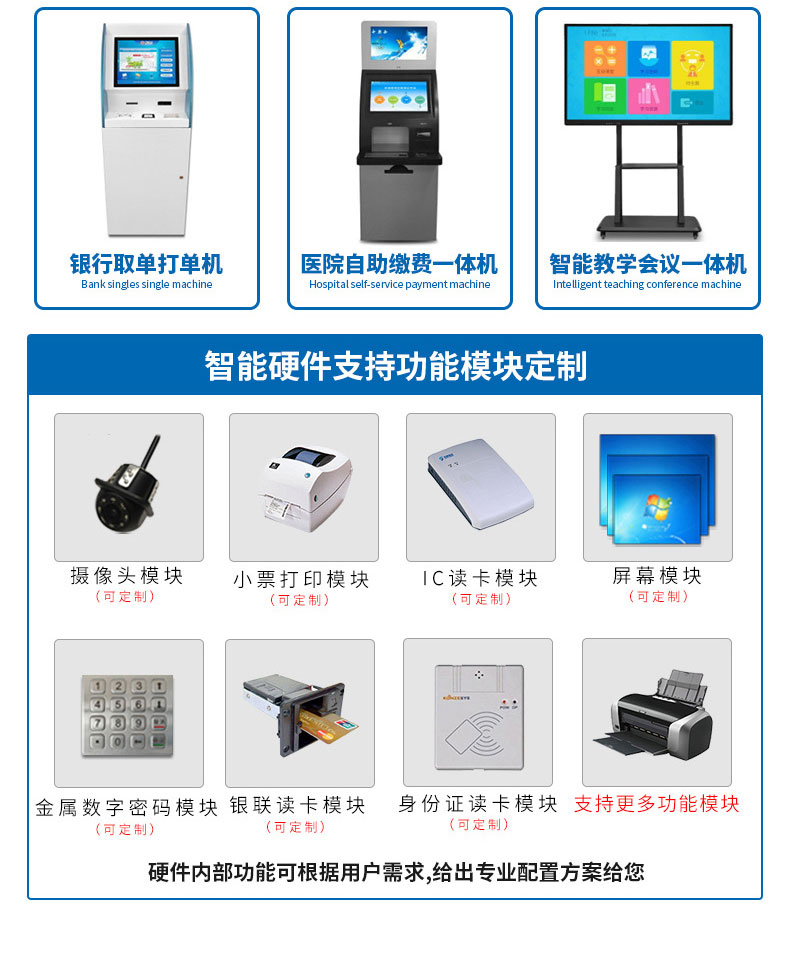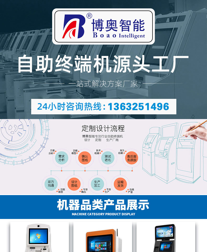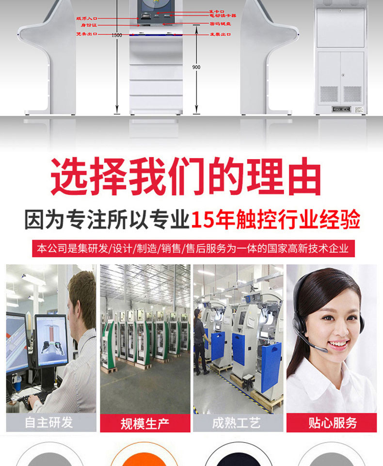 專業(yè)提供電腦觸控產(chǎn)品、自助服務(wù)終端的設(shè)計及生產(chǎn)服務(wù),主要產(chǎn)品自助終端機、自助打印機、自助取票機、自助查詢機、自助繳費機、自助發(fā)卡機、自助政務(wù)一體機,產(chǎn)品使用于各個行業(yè);醫(yī)院、學(xué)校、銀行、酒店、景區(qū)等。。。。。公司擁有專業(yè)的生產(chǎn)線,嚴(yán)格的質(zhì)量把控。耐心的咨詢服務(wù)團隊及專業(yè)的技術(shù)負(fù)責(zé)團體。