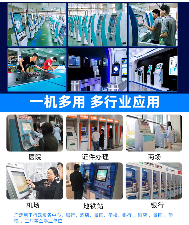 專業(yè)提供電腦觸控產品、自助服務終端的設計及生產服務,主要產品自助終端機、自助打印機、自助取票機、自助查詢機、自助繳費機、自助發(fā)卡機、自助政務一體機,產品使用于各個行業(yè);醫(yī)院、學校、銀行、酒店、景區(qū)等。。。。。公司擁有專業(yè)的生產線,嚴格的質量把控。耐心的咨詢服務團隊及專業(yè)的技術負責團體。