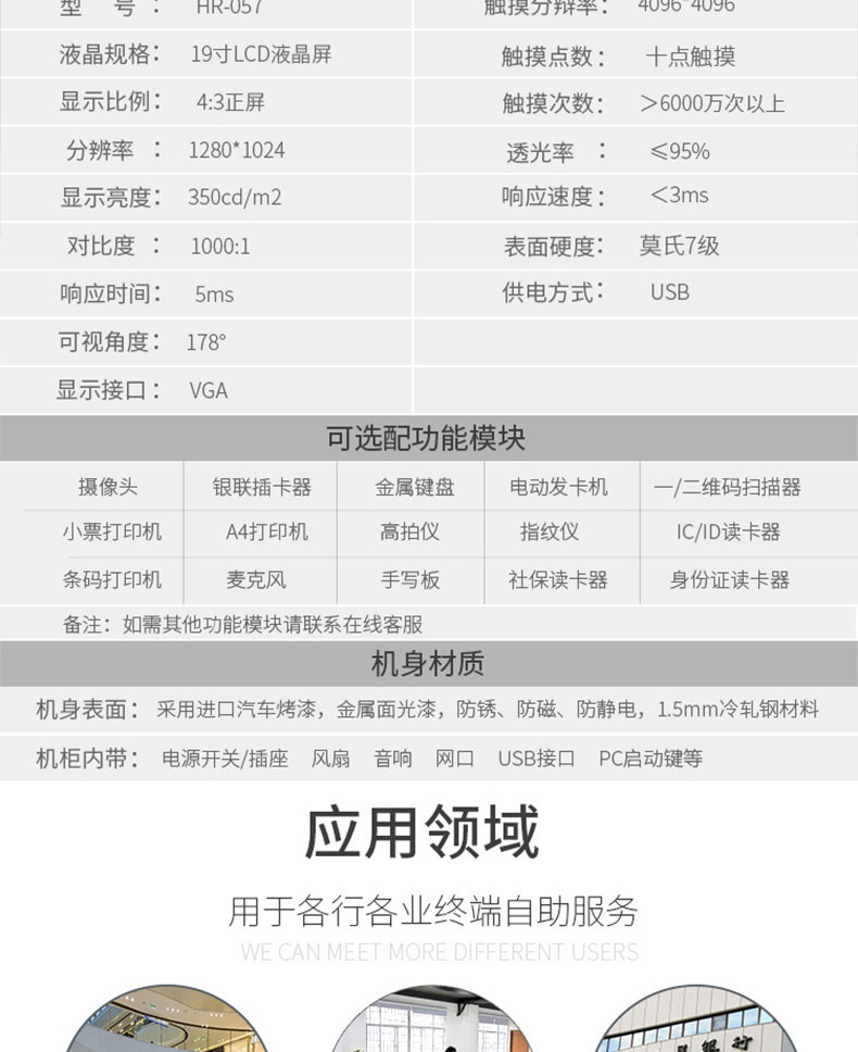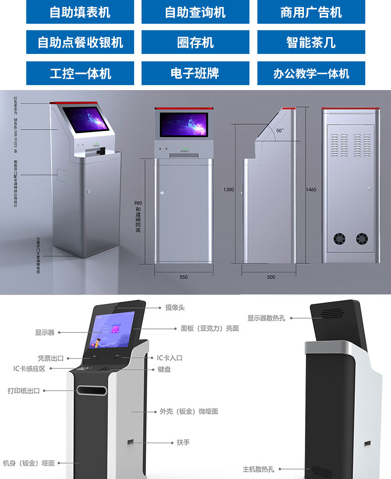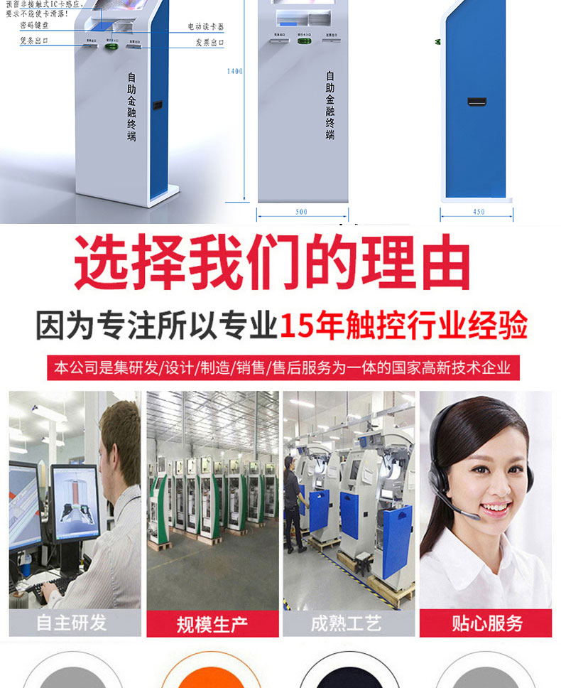 專業(yè)提供電腦觸控產(chǎn)品、自助服務(wù)終端的設(shè)計及生產(chǎn)服務(wù),主要產(chǎn)品自助終端機(jī)、自助打印機(jī)、自助取票機(jī)、自助查詢機(jī)、自助繳費機(jī)、自助發(fā)卡機(jī)、自助政務(wù)一體機(jī),產(chǎn)品使用于各個行業(yè);醫(yī)院、學(xué)校、銀行、酒店、景區(qū)等。。。。。公司擁有專業(yè)的生產(chǎn)線,嚴(yán)格的質(zhì)量把控。耐心的咨詢服務(wù)團(tuán)隊及專業(yè)的技術(shù)負(fù)責(zé)團(tuán)體。