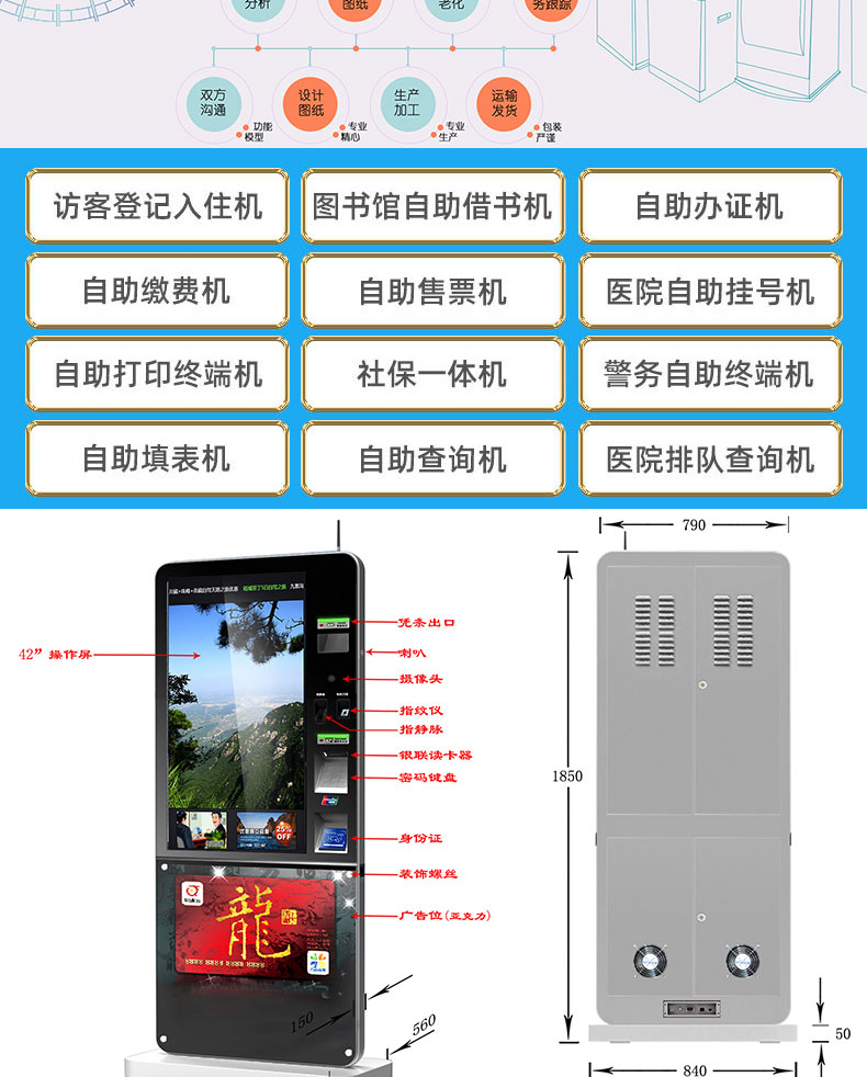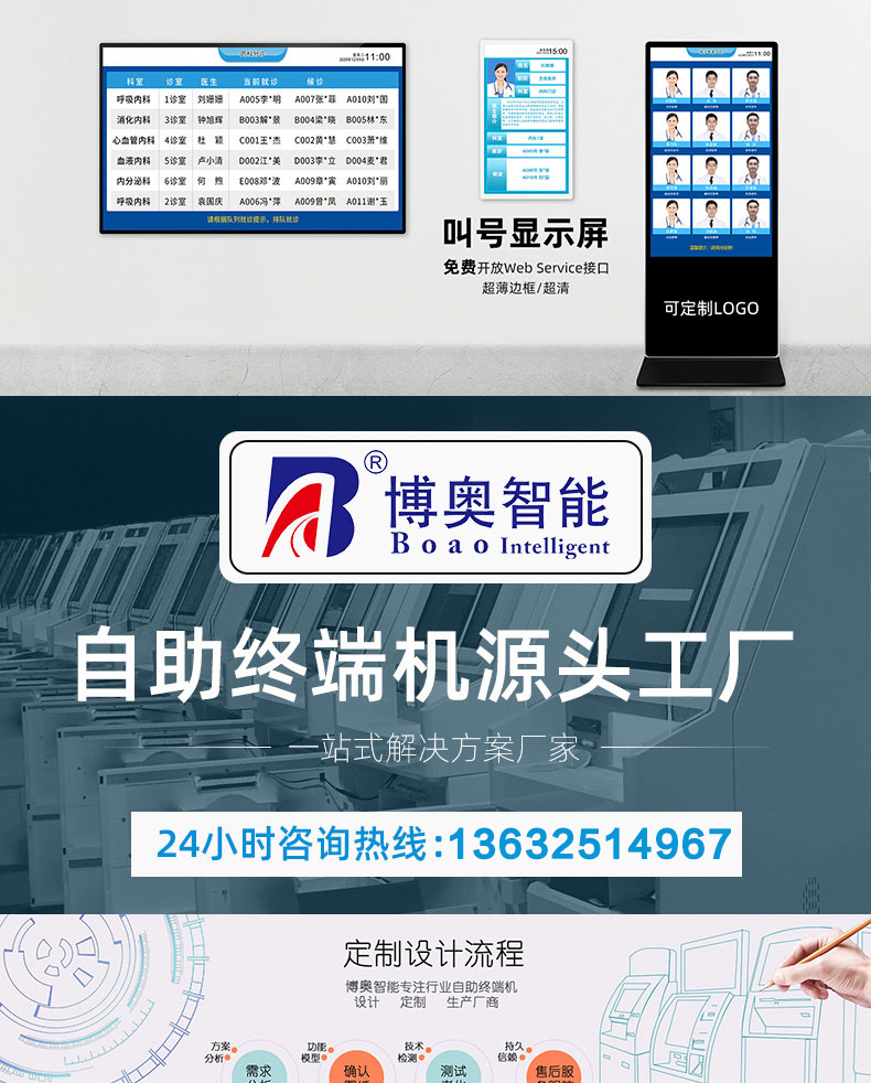 自助終端機(jī)定制:定制各種場景各種款式非標(biāo)終端機(jī);例如訪客機(jī)、景區(qū)自助取票機(jī)、醫(yī)院繳費查詢機(jī)、醫(yī)院自助取單機(jī)、社保查詢機(jī)、室內(nèi)外廣告機(jī)、排隊叫號機(jī)、工控一體機(jī)、電力繳費查詢機(jī)、圖書自助銷售機(jī)、便攜式計算機(jī)、酒店自助入住機(jī)、自助收銀機(jī)等終端。