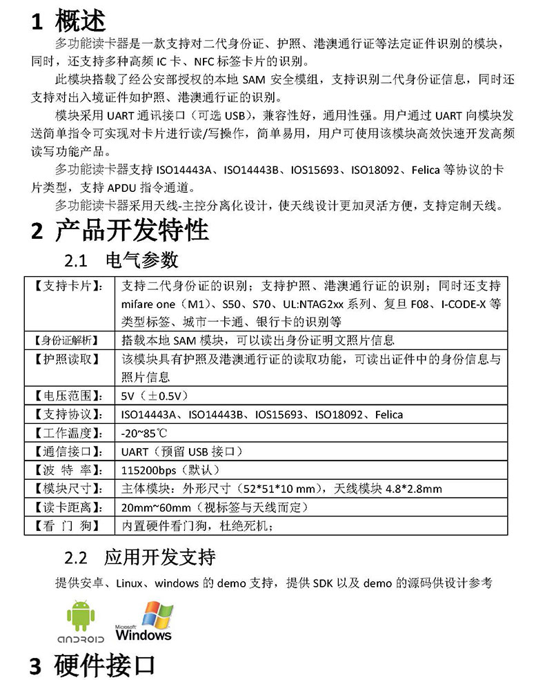 此模塊搭載了經(jīng)公安部授權(quán)的本地 SAM 安全模組,支持識(shí)別二代身份證信息,同時(shí)還支持對(duì)出入境證件如護(hù)照、港澳通行證的識(shí)別。