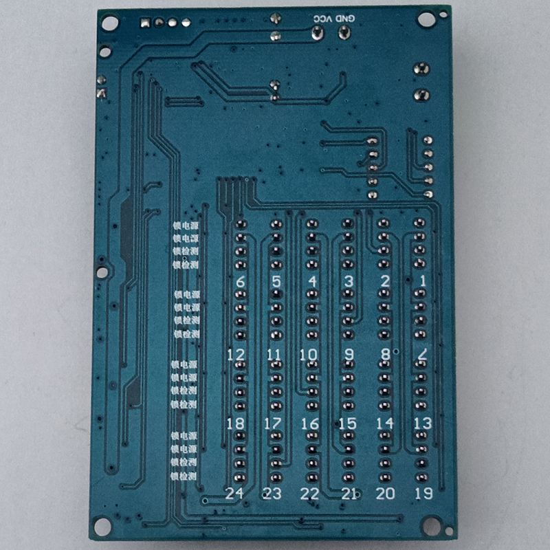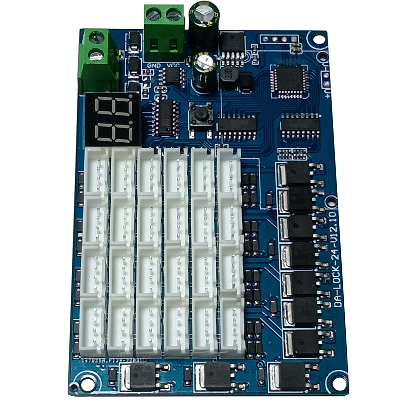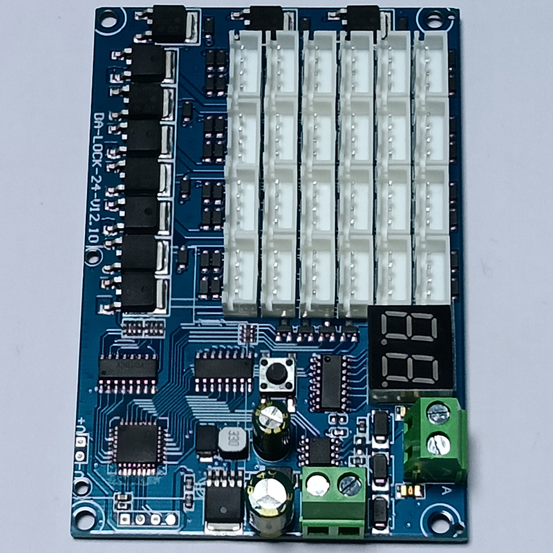 24路鎖控板又名為電子鎖控制模塊,主要用來控制各類格子柜門電子鎖的開與關(guān),板子集成24路鎖控杜邦接口,485通信接口,DC電源接口,鎖控地址顯示模塊,一鍵全開功能!板子通過485通信協(xié)議,實(shí)現(xiàn)電腦串口助手發(fā)送數(shù)據(jù)開鎖和獲取箱門狀態(tài)反饋!