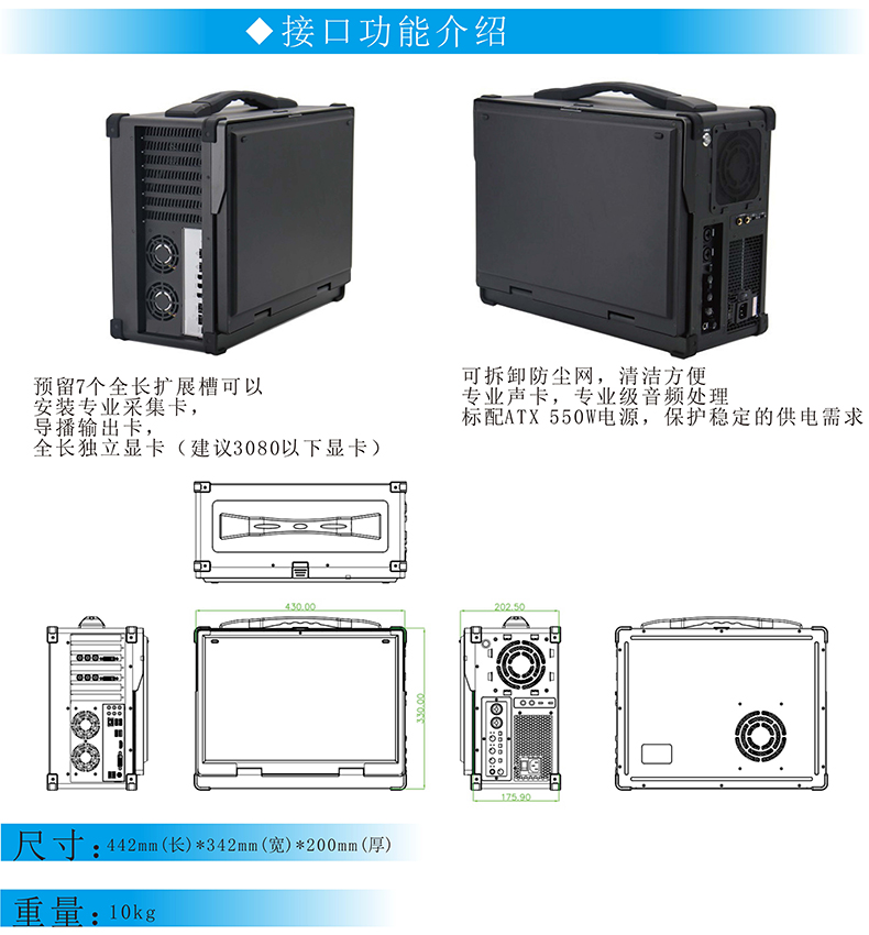 廣電影視導(dǎo)播直播錄播系統(tǒng)一體計(jì)算機(jī)工業(yè)級(jí)加固防振室外高亮便攜式17.3寸工控電腦支持定制加工國(guó)產(chǎn)系統(tǒng),采用鋁鎂合外殼,體積輕巧,性能穩(wěn)定,方便攜帶等特點(diǎn);集成導(dǎo)播鍵盤、音頻模塊、視頻加速卡、導(dǎo)播輸出卡、17.3寸高亮屏,保證戶外使用也清晰可見(jiàn),用于廣電行業(yè)和教育行業(yè)的專業(yè)級(jí)導(dǎo)播/直播便攜設(shè)備。