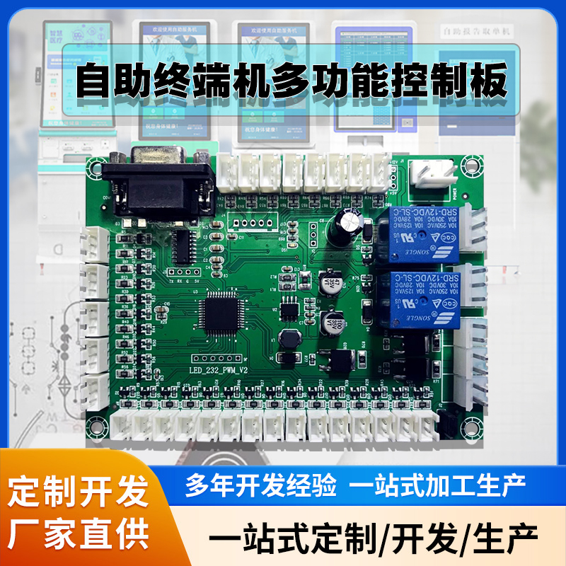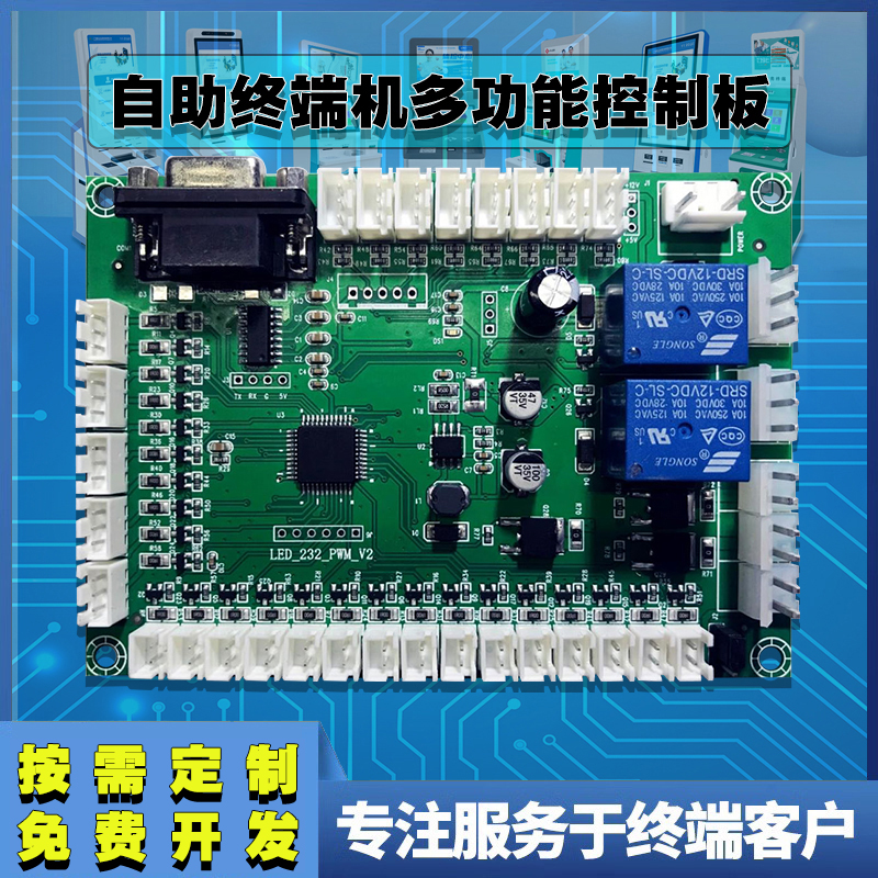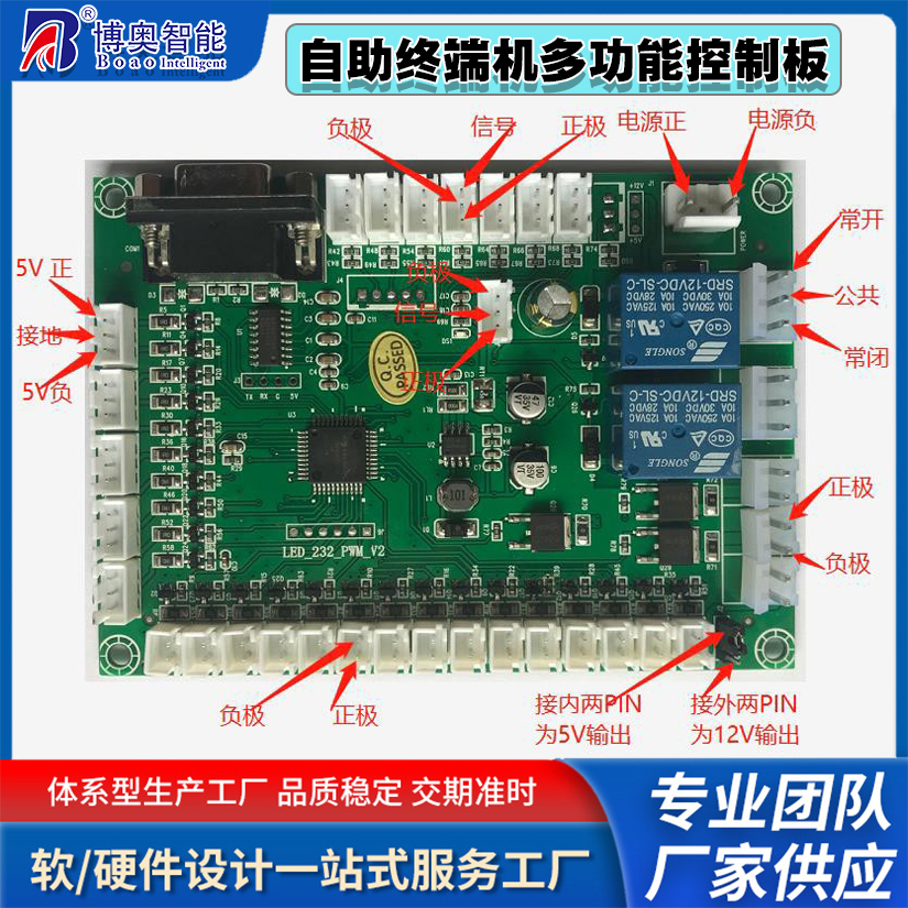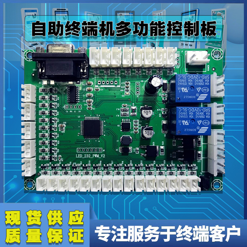 該產品是專為自助終端設備配套開發(fā)的一款終端機多功能控制模塊,可應用此模塊實現(xiàn)各模塊操作指示燈的提示控制、接收開關量的輸入上傳、繼電器常開、常閉輸出、PWM 輸出功能以及溫濕度檢測功能;